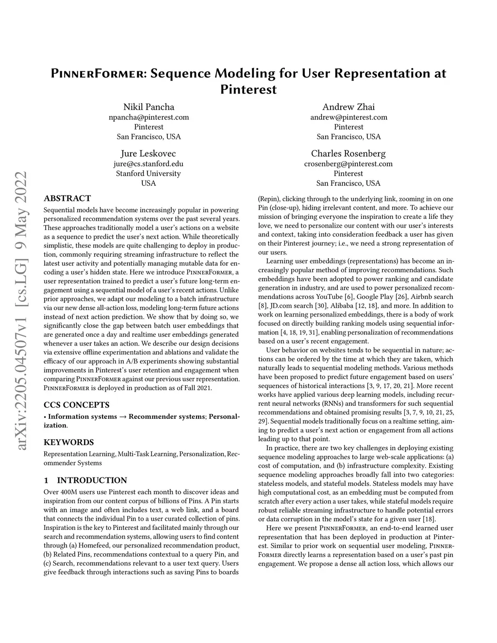 PinnerFormer: Sequence Modeling for User Representation at Pinterest