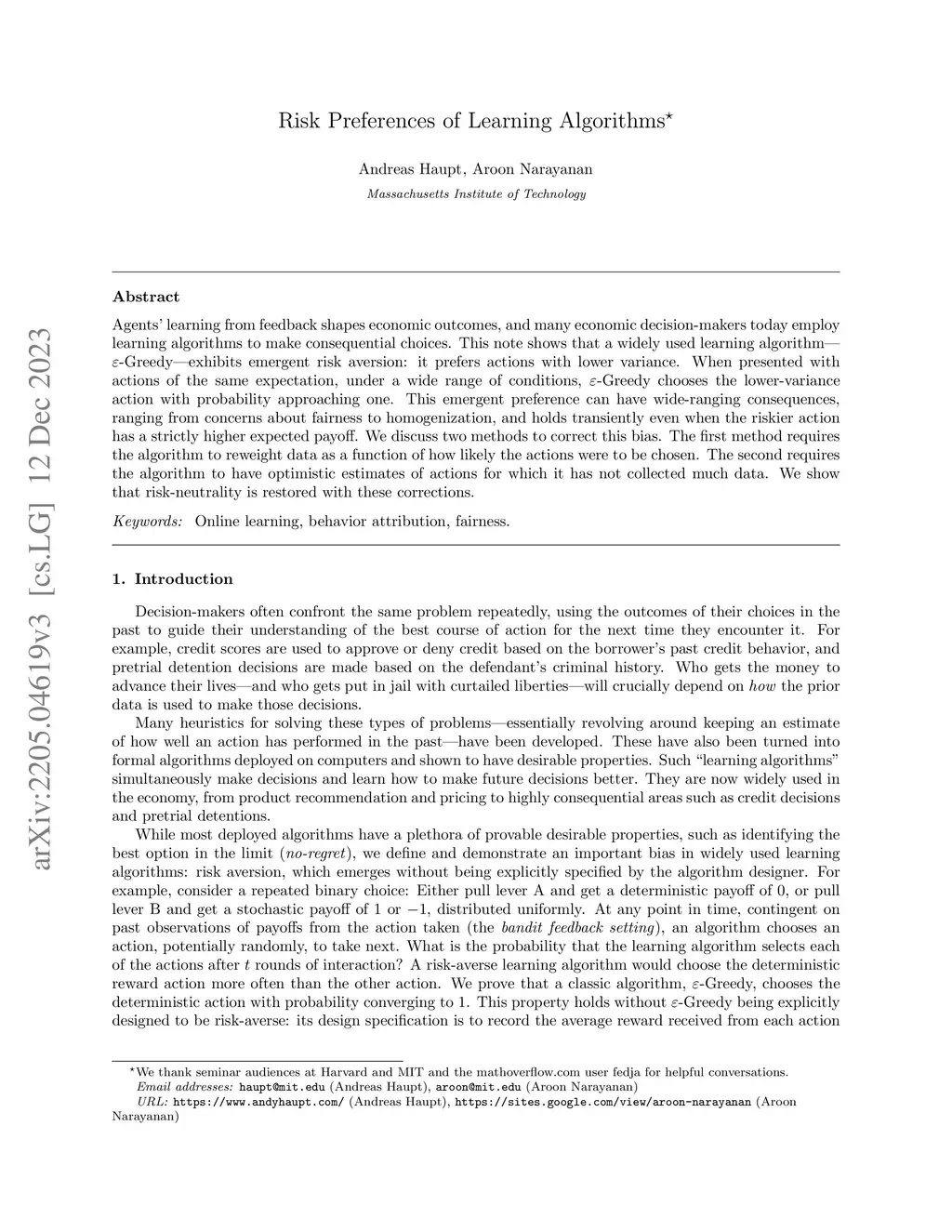 Agents' learning from feedback shapes economic outcomes, and many economic decision-makers today employ learning algorithms to make consequential choices. This note shows that a widely used learning algorithm, -Greedy, exhibits emergent risk aversion: it prefers actions with lower variance. When presented with actions of the same expectation, under a wide range of conditions, -Greedy chooses the lower-variance action with probability approaching one. This emergent preference can have wide-ranging consequences, ranging from concerns about fairness to homogenization, and holds transiently even when the riskier action has a strictly higher expected payoff. We discuss two methods to correct this bias. The first method requires the algorithm to reweight data as a function of how likely the actions were to be chosen. The second requires the algorithm to have optimistic estimates of actions for which it has not collected much data. We show that risk-neutrality is restored with these corrections.