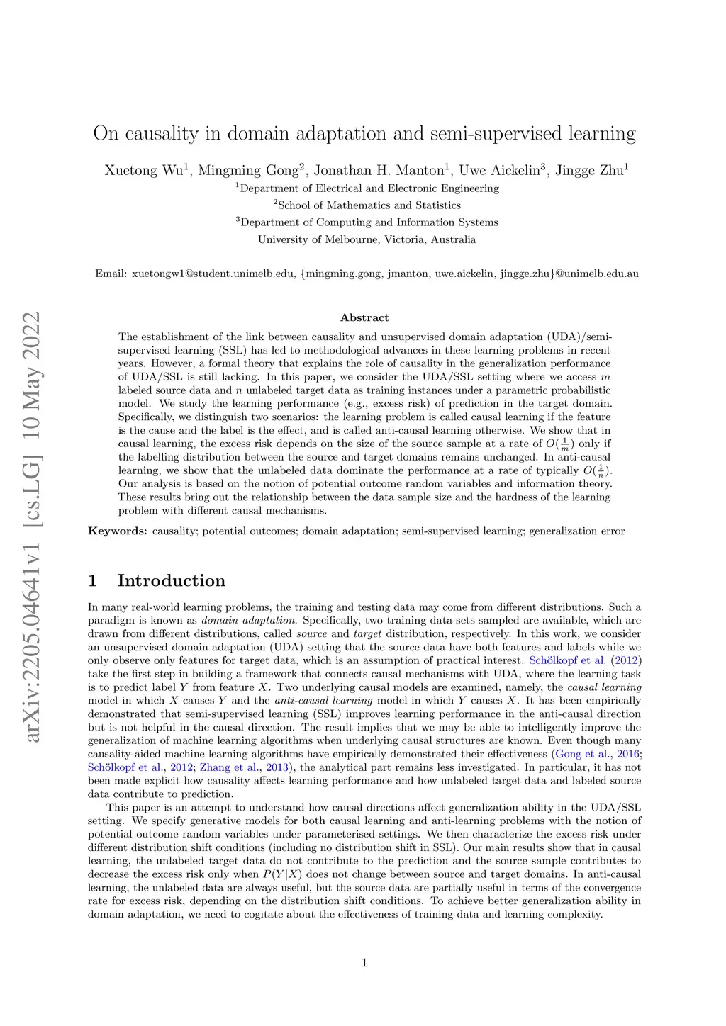 The establishment of the link between causality and unsupervised domain adaptation (UDA)/semi-supervised learning (SSL) has led to methodological advances in these learning problems in recent years. However, a formal theory that explains the role of causality in the generalization performance of UDA/SSL is still lacking. In this paper, we consider the UDA/SSL setting where we access m labeled source data and n unlabeled target data as training instances under a parametric probabilistic model. We study the learning performance (e.g., excess risk) of prediction in the target domain. Specifically, we distinguish two scenarios: the learning problem is called causal learning if the feature is the cause and the label is the effect, and is called anti-causal learning otherwise. We show that in causal learning, the excess risk depends on the size of the source sample at a rate of O(1/m) only if the labelling distribution between the source and target domains remains unchanged. In anti-causal learning, we show that the unlabeled data dominate the performance at a rate of typically O(1/n). Our analysis is based on the notion of potential outcome random variables and information theory. These results bring out the relationship between the data sample size and the hardness of the learning problem with different causal mechanisms.