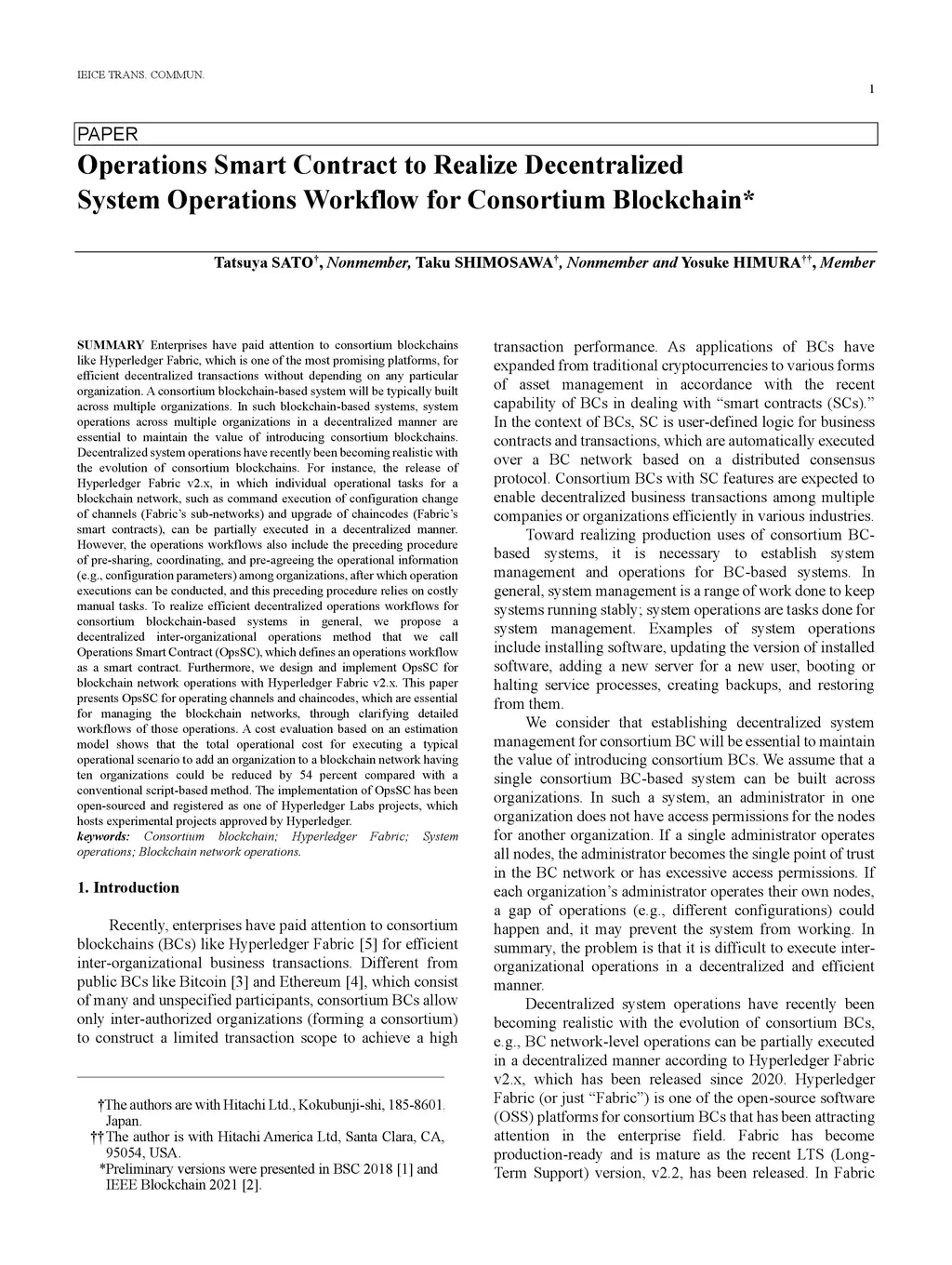 Enterprises have paid attention to consortium blockchains like Hyperledger Fabric, which is one of the most promising platforms, for efficient decentralized transactions without depending on any particular organization. A consortium blockchain-based system will be typically built across multiple organizations. In such blockchain-based systems, system operations across multiple organizations in a decentralized manner are essential to maintain the value of introducing consortium blockchains. Decentralized system operations have recently been becoming realistic with the evolution of consortium blockchains. For instance, the release of Hyperledger Fabric v2.x, in which individual operational tasks for a blockchain network, such as command execution of configuration change of channels (Fabric's sub-networks) and upgrade of chaincodes (Fabric's smart contracts), can be partially executed in a decentralized manner. However, the operations workflows also include the preceding procedure of pre-sharing, coordinating, and pre-agreeing the operational information (e.g., configuration parameters) among organizations, after which operation executions can be conducted, and this preceding procedure relies on costly manual tasks. To realize efficient decentralized operations workflows for consortium blockchain-based systems in general, we propose a decentralized inter-organizational operations method that we call Operations Smart Contract (OpsSC), which defines an operations workflow as a smart contract. Furthermore, we design and implement OpsSC for blockchain network operations with Hyperledger Fabric v2.x. This paper presents OpsSC for operating channels and chaincodes, which are essential for managing the blockchain networks, through clarifying detailed workflows of those operations. The implementation of OpsSC has been open-sourced and registered as one of Hyperledger Labs projects.