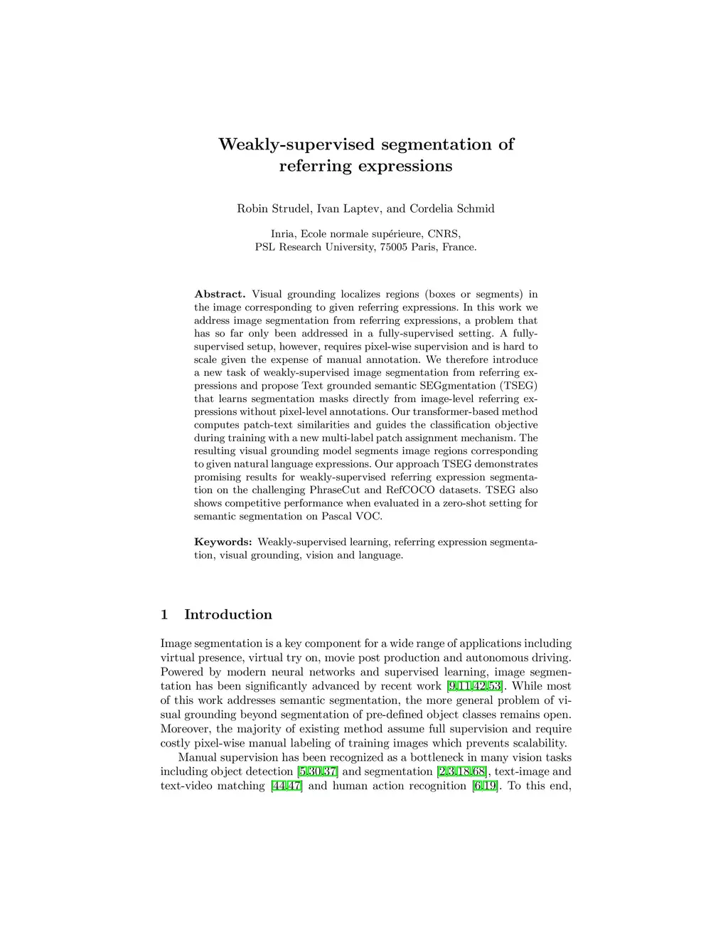 Visual grounding localizes regions (boxes or segments) in the image corresponding to given referring expressions. In this work we address image segmentation from referring expressions, a problem that has so far only been addressed in a fully-supervised setting. A fully-supervised setup, however, requires pixel-wise supervision and is hard to scale given the expense of manual annotation. We therefore introduce a new task of weakly-supervised image segmentation from referring expressions and propose Text grounded semantic SEGgmentation (TSEG) that learns segmentation masks directly from image-level referring expressions without pixel-level annotations. Our transformer-based method computes patch-text similarities and guides the classification objective during training with a new multi-label patch assignment mechanism. The resulting visual grounding model segments image regions corresponding to given natural language expressions. Our approach TSEG demonstrates promising results for weakly-supervised referring expression segmentation on the challenging PhraseCut and RefCOCO datasets. TSEG also shows competitive performance when evaluated in a zero-shot setting for semantic segmentation on Pascal VOC.