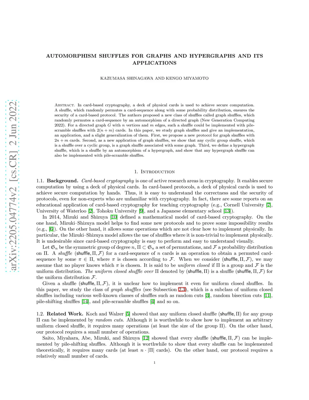 In card-based cryptography, a deck of physical cards is used to achieve secure computation. A shuffle, which randomly permutes a card-sequence along with some probability distribution, ensures the security of a card-based protocol. The authors proposed a new class of shuffles called graph shuffles, which randomly permutes a card-sequence by an automorphism of a directed graph (New Generation Computing 2022). For a directed graph with vertices and edges, such a shuffle could be implemented with pile-scramble shuffles with cards. In this paper, we study graph shuffles and give an implementation, an application, and a slight generalization of them. First, we propose a new protocol for graph shuffles with cards. Second, as a new application of graph shuffles, we show that any cyclic group shuffle, which is a shuffle over a cyclic group, is a graph shuffle associated with some graph. Third, we define a hypergraph shuffle, which is a shuffle by an automorphism of a hypergraph, and show that any hypergraph shuffle can also be implemented with pile-scramble shuffles.