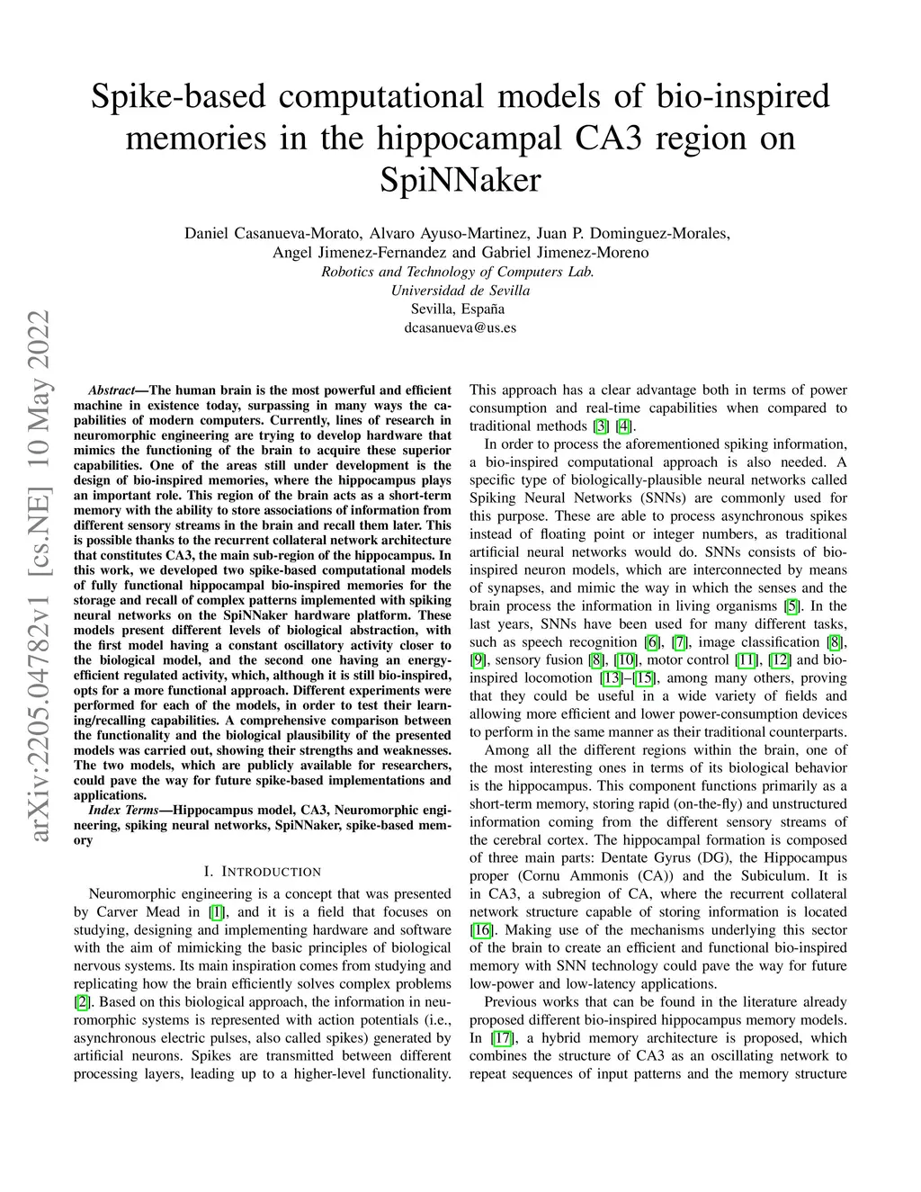 The human brain is the most powerful and efficient machine in existence today, surpassing in many ways the capabilities of modern computers. Currently, lines of research in neuromorphic engineering are trying to develop hardware that mimics the functioning of the brain to acquire these superior capabilities. One of the areas still under development is the design of bio-inspired memories, where the hippocampus plays an important role. This region of the brain acts as a short-term memory with the ability to store associations of information from different sensory streams in the brain and recall them later. This is possible thanks to the recurrent collateral network architecture that constitutes CA3, the main sub-region of the hippocampus. In this work, we developed two spike-based computational models of fully functional hippocampal bio-inspired memories for the storage and recall of complex patterns implemented with spiking neural networks on the SpiNNaker hardware platform. These models present different levels of biological abstraction, with the first model having a constant oscillatory activity closer to the biological model, and the second one having an energy-efficient regulated activity, which, although it is still bio-inspired, opts for a more functional approach. Different experiments were performed for each of the models, in order to test their learning/recalling capabilities. A comprehensive comparison between the functionality and the biological plausibility of the presented models was carried out, showing their strengths and weaknesses. The two models, which are publicly available for researchers, could pave the way for future spike-based implementations and applications.