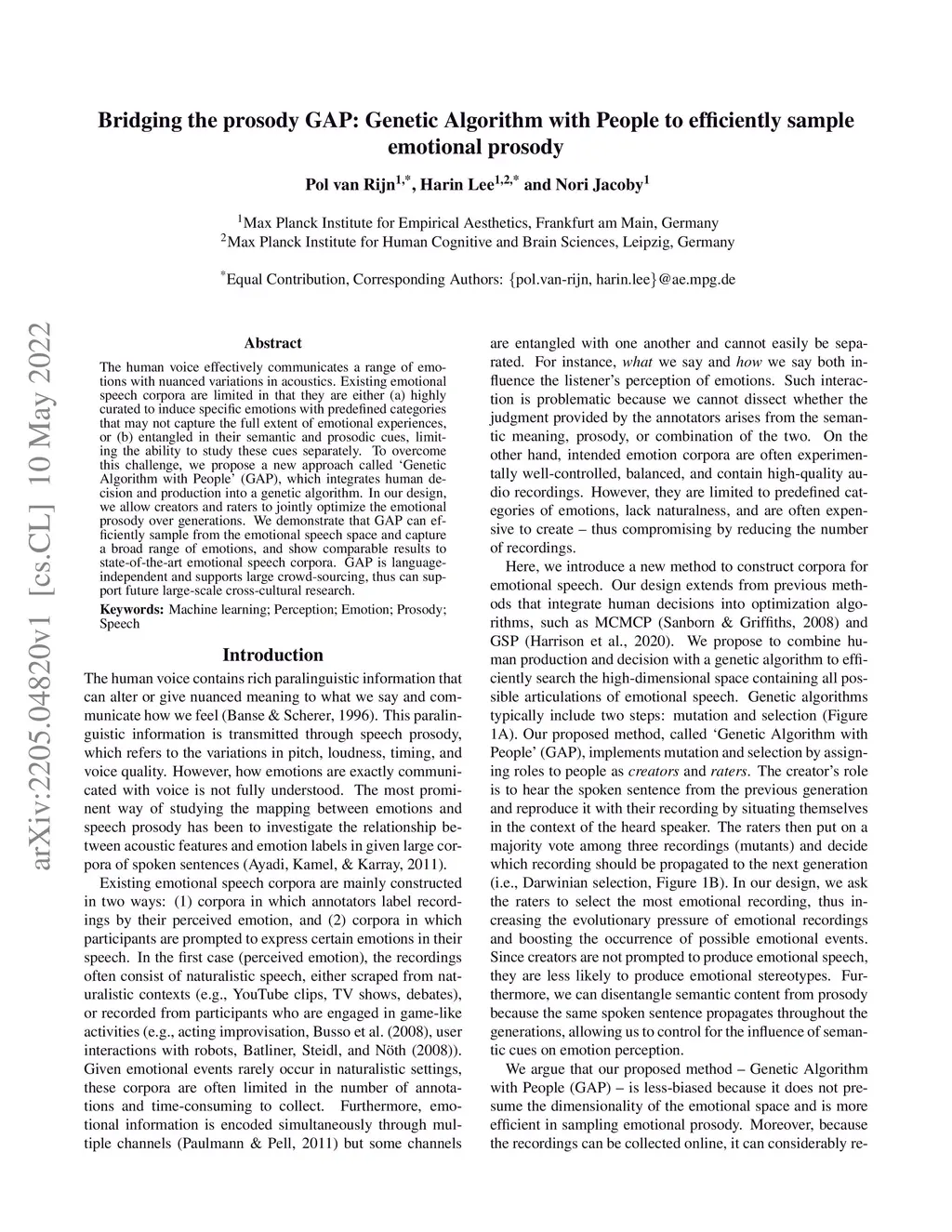 The human voice effectively communicates a range of emotions with nuanced variations in acoustics. Existing emotional speech corpora are limited in that they are either (a) highly curated to induce specific emotions with predefined categories that may not capture the full extent of emotional experiences, or (b) entangled in their semantic and prosodic cues, limiting the ability to study these cues separately. To overcome this challenge, we propose a new approach called 'Genetic Algorithm with People' (GAP), which integrates human decision and production into a genetic algorithm. In our design, we allow creators and raters to jointly optimize the emotional prosody over generations. We demonstrate that GAP can efficiently sample from the emotional speech space and capture a broad range of emotions, and show comparable results to state-of-the-art emotional speech corpora. GAP is language-independent and supports large crowd-sourcing, thus can support future large-scale cross-cultural research.