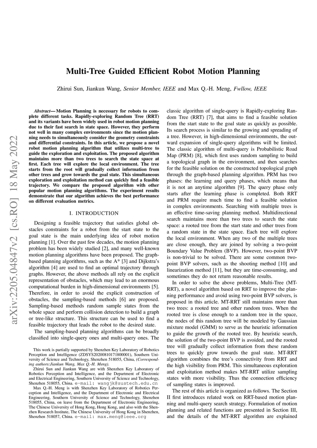 Motion Planning is necessary for robots to complete different tasks. Rapidly-exploring Random Tree (RRT) and its variants have been widely used in robot motion planning due to their fast search in state space. However, they perform not well in many complex environments since the motion planning needs to simultaneously consider the geometry constraints and differential constraints. In this article, we propose a novel robot motion planning algorithm that utilizes multi-tree to guide the exploration and exploitation. The proposed algorithm maintains more than two trees to search the state space at first. Each tree will explore the local environment. The tree starts from the root will gradually collect information from other trees and grow towards the goal state. This simultaneous exploration and exploitation method can quickly find a feasible trajectory. We compare the proposed algorithm with other popular motion planning algorithms. The experiment results demonstrate that our algorithm achieves the best performance on different evaluation metrics.