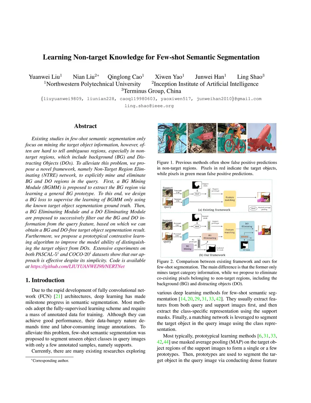 Existing studies in few-shot semantic segmentation only focus on mining the target object information, however, often are hard to tell ambiguous regions, especially in non-target regions, which include background (BG) and Distracting Objects (DOs). To alleviate this problem, we propose a novel framework, namely Non-Target Region Eliminating (NTRE) network, to explicitly mine and eliminate BG and DO regions in the query. First, a BG Mining Module (BGMM) is proposed to extract the BG region via learning a general BG prototype. To this end, we design a BG loss to supervise the learning of BGMM only using the known target object segmentation ground truth. Then, a BG Eliminating Module and a DO Eliminating Module are proposed to successively filter out the BG and DO information from the query feature, based on which we can obtain a BG and DO-free target object segmentation result. Furthermore, we propose a prototypical contrastive learning algorithm to improve the model ability of distinguishing the target object from DOs. Extensive experiments on both PASCAL-5i and COCO-20i datasets show that our approach is effective despite its simplicity.