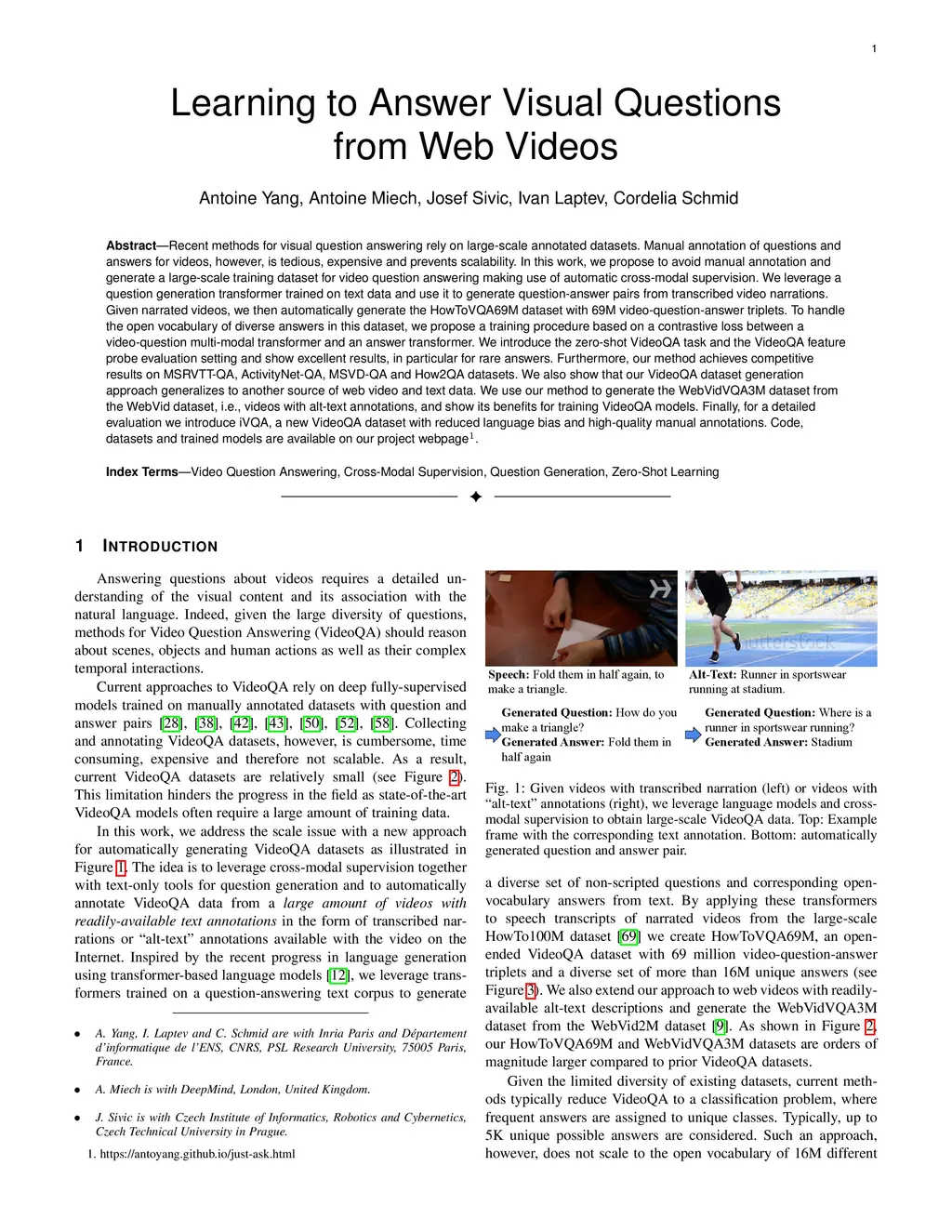 Recent methods for visual question answering rely on large-scale annotated datasets. Manual annotation of questions and answers for videos, however, is tedious, expensive and prevents scalability. In this work, we propose to avoid manual annotation and generate a large-scale training dataset for video question answering making use of automatic cross-modal supervision. We leverage a question generation transformer trained on text data and use it to generate question-answer pairs from transcribed video narrations. Given narrated videos, we then automatically generate the HowToVQA69M dataset with 69M video-question-answer triplets. To handle the open vocabulary of diverse answers in this dataset, we propose a training procedure based on a contrastive loss between a video-question multi-modal transformer and an answer transformer. We introduce the zero-shot VideoQA task and the VideoQA feature probe evaluation setting and show excellent results, in particular for rare answers. Furthermore, our method achieves competitive results on MSRVTT-QA, ActivityNet-QA, MSVD-QA and How2QA datasets. We also show that our VideoQA dataset generation approach generalizes to another source of web video and text data. We use our method to generate the WebVidVQA3M dataset from the WebVid dataset, i.e., videos with alt-text annotations, and show its benefits for training VideoQA models. Finally, for a detailed evaluation we introduce iVQA, a new VideoQA dataset with reduced language bias and high-quality manual annotations. Code, datasets and trained models are available at https://antoyang.github.io/just-ask.html