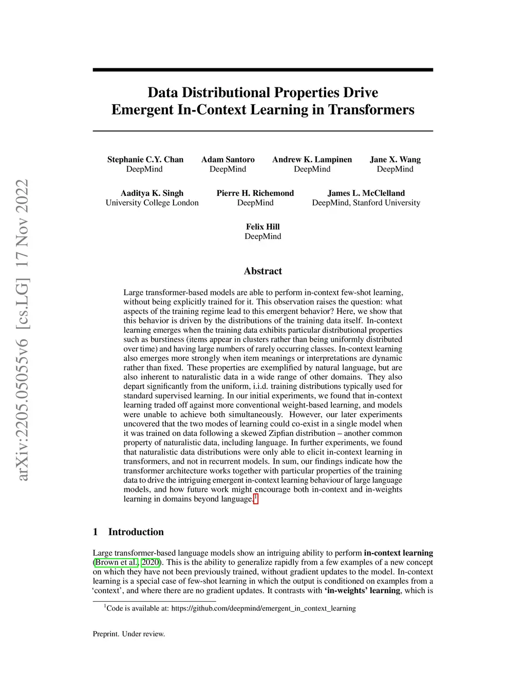 Large transformer-based models are able to perform in-context few-shot learning, without being explicitly trained for it. This observation raises the question: what aspects of the training regime lead to this emergent behavior? Here, we show that this behavior is driven by the distributions of the training data itself. In-context learning emerges when the training data exhibits particular distributional properties such as burstiness (items appear in clusters rather than being uniformly distributed over time) and having large numbers of rarely occurring classes. In-context learning also emerges more strongly when item meanings or interpretations are dynamic rather than fixed. These properties are exemplified by natural language, but are also inherent to naturalistic data in a wide range of other domains. They also depart significantly from the uniform, i.i.d. training distributions typically used for standard supervised learning. In our initial experiments, we found that in-context learning traded off against more conventional weight-based learning, and models were unable to achieve both simultaneously. However, our later experiments uncovered that the two modes of learning could co-exist in a single model when it was trained on data following a skewed Zipfian distribution -- another common property of naturalistic data, including language. In further experiments, we found that naturalistic data distributions were only able to elicit in-context learning in transformers, and not in recurrent models. In sum, our findings indicate how the transformer architecture works together with particular properties of the training data to drive the intriguing emergent in-context learning behaviour of large language models, and how future work might encourage both in-context and in-weights learning in domains beyond language.
