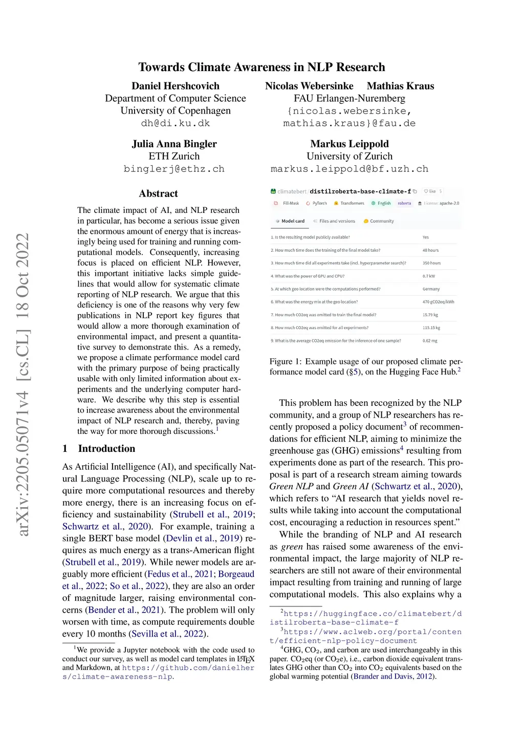 The climate impact of AI, and NLP research in particular, has become a serious issue given the enormous amount of energy that is increasingly being used for training and running computational models. Consequently, increasing focus is placed on efficient NLP. However, this important initiative lacks simple guidelines that would allow for systematic climate reporting of NLP research. We argue that this deficiency is one of the reasons why very few publications in NLP report key figures that would allow a more thorough examination of environmental impact. As a remedy, we propose a climate performance model card with the primary purpose of being practically usable with only limited information about experiments and the underlying computer hardware. We describe why this step is essential to increase awareness about the environmental impact of NLP research and, thereby, paving the way for more thorough discussions.