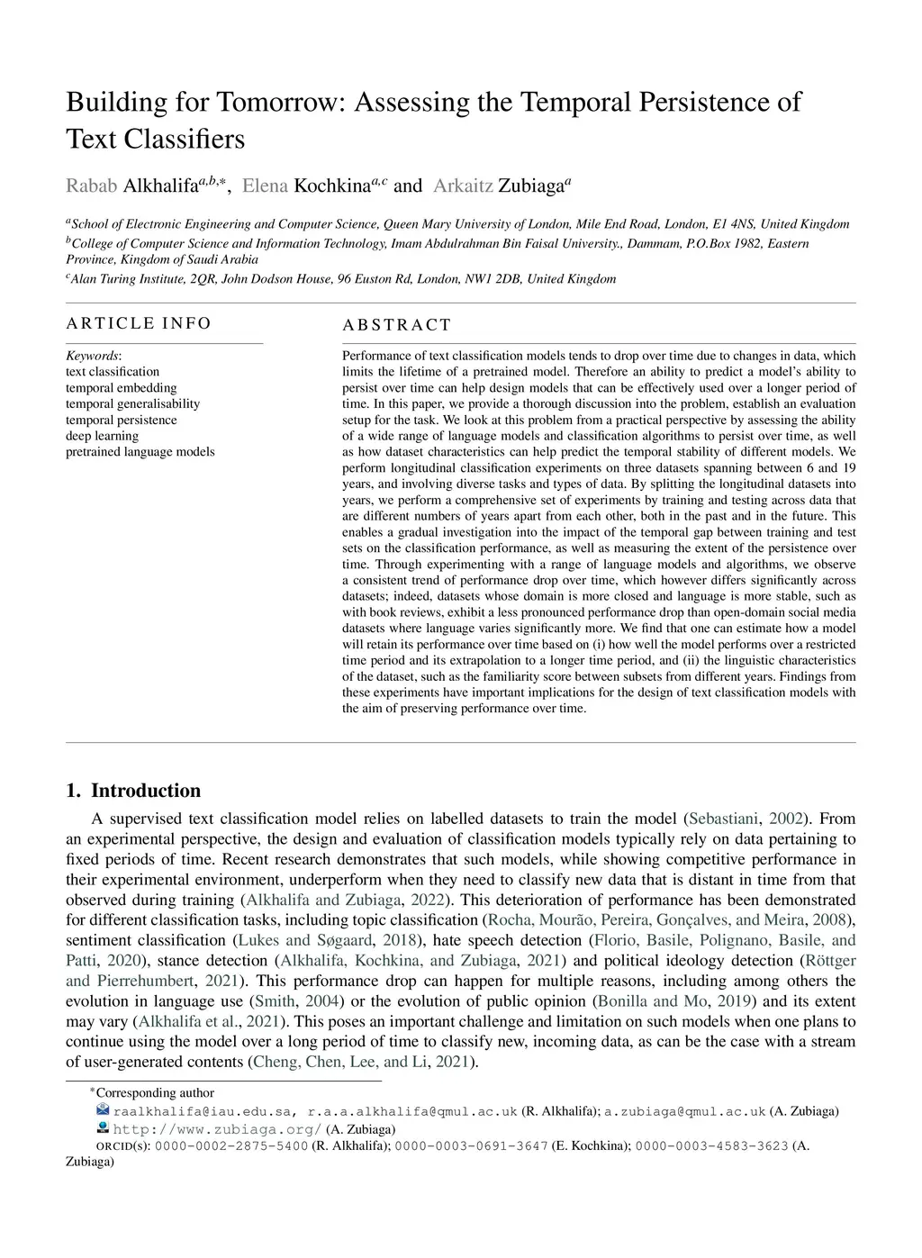 Performance of text classification models tends to drop over time due to changes in data, which limits the lifetime of a pretrained model. Therefore an ability to predict a model's ability to persist over time can help design models that can be effectively used over a longer period of time. In this paper, we provide a thorough discussion into the problem, establish an evaluation setup for the task. We look at this problem from a practical perspective by assessing the ability of a wide range of language models and classification algorithms to persist over time, as well as how dataset characteristics can help predict the temporal stability of different models. We perform longitudinal classification experiments on three datasets spanning between 6 and 19 years, and involving diverse tasks and types of data. By splitting the longitudinal datasets into years, we perform a comprehensive set of experiments by training and testing across data that are different numbers of years apart from each other, both in the past and in the future. This enables a gradual investigation into the impact of the temporal gap between training and test sets on the classification performance, as well as measuring the extent of the persistence over time.