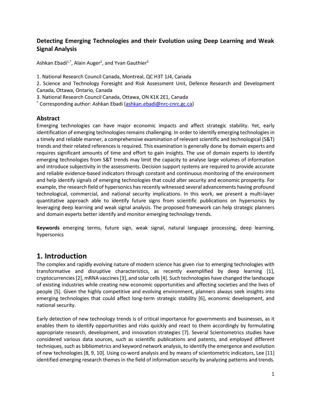 Emerging technologies can have major economic impacts and affect strategic stability. Yet, early identification of emerging technologies remains challenging. In order to identify emerging technologies in a timely and reliable manner, a comprehensive examination of relevant scientific and technological (S&T) trends and their related references is required. This examination is generally done by domain experts and requires significant amounts of time and effort to gain insights. The use of domain experts to identify emerging technologies from S&T trends may limit the capacity to analyse large volumes of information and introduce subjectivity in the assessments. Decision support systems are required to provide accurate and reliable evidence-based indicators through constant and continuous monitoring of the environment and help identify signals of emerging technologies that could alter security and economic prosperity. For example, the research field of hypersonics has recently witnessed several advancements having profound technological, commercial, and national security implications. In this work, we present a multi-layer quantitative approach able to identify future signs from scientific publications on hypersonics by leveraging deep learning and weak signal analysis. The proposed framework can help strategic planners and domain experts better identify and monitor emerging technology trends.