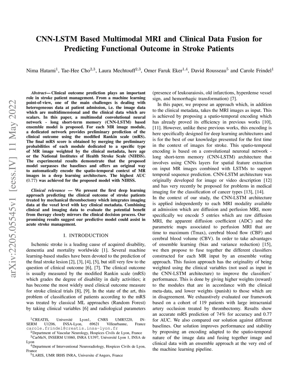 Clinical outcome prediction plays an important role in stroke patient management. From a machine learning point-of-view, one of the main challenges is dealing with heterogeneous data at patient admission, i.e. the image data which are multidimensional and the clinical data which are scalars. In this paper, a multimodal convolutional neural network - long short-term memory (CNN-LSTM) based ensemble model is proposed. For each MR image module, a dedicated network provides preliminary prediction of the clinical outcome using the modified Rankin scale (mRS). The final mRS score is obtained by merging the preliminary probabilities of each module dedicated to a specific type of MR image weighted by the clinical metadata, here age or the National Institutes of Health Stroke Scale (NIHSS). The experimental results demonstrate that the proposed model surpasses the baselines and offers an original way to automatically encode the spatio-temporal context of MR images in a deep learning architecture. The highest AUC (0.77) was achieved for the proposed model with NIHSS.
