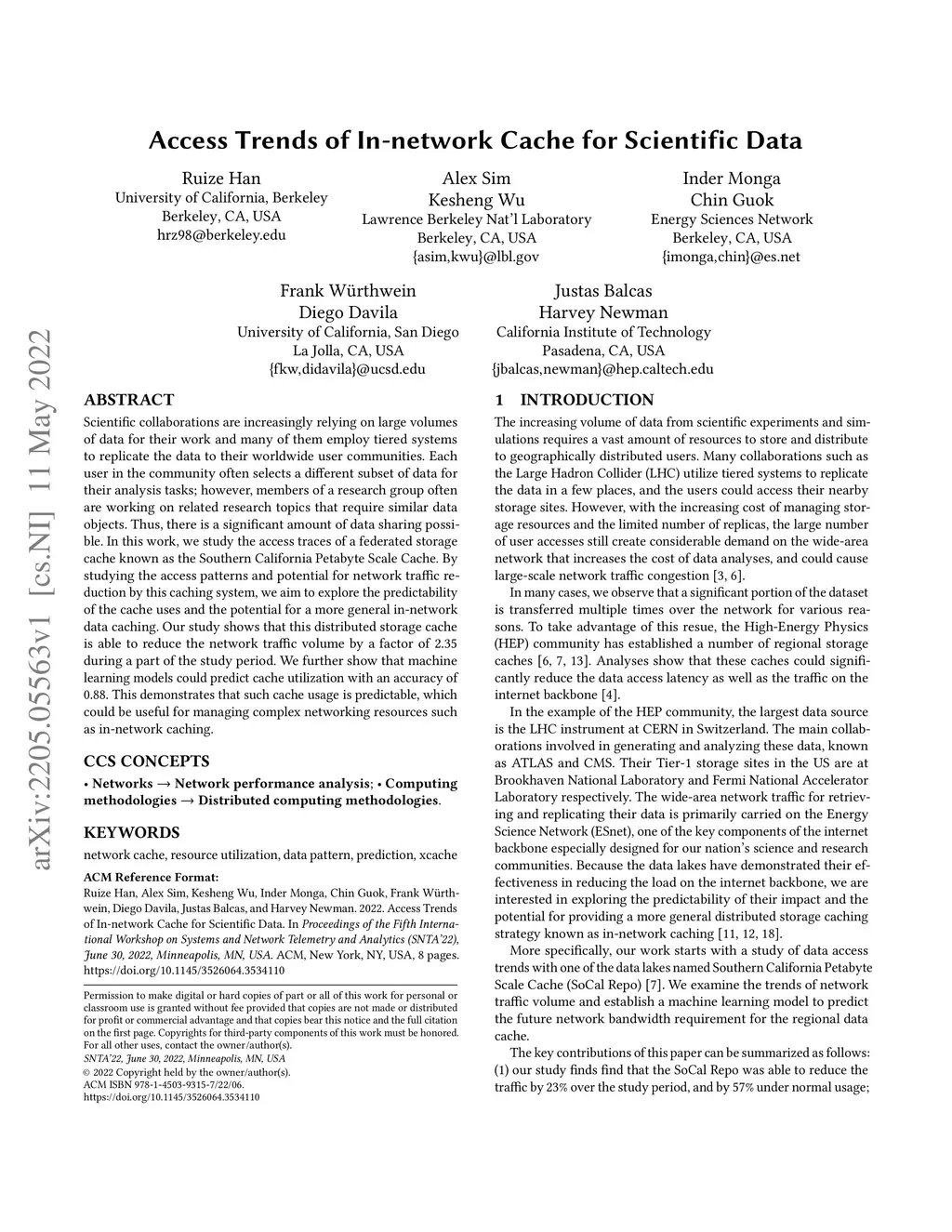 Scientific collaborations are increasingly relying on large volumes of data for their work and many of them employ tiered systems to replicate the data to their worldwide user communities. Each user in the community often selects a different subset of data for their analysis tasks; however, members of a research group often are working on related research topics that require similar data objects. Thus, there is a significant amount of data sharing possible. In this work, we study the access traces of a federated storage cache known as the Southern California Petabyte Scale Cache. By studying the access patterns and potential for network traffic reduction by this caching system, we aim to explore the predictability of the cache uses and the potential for a more general in-network data caching. Our study shows that this distributed storage cache is able to reduce the network traffic volume by a factor of 2.35 during a part of the study period. We further show that machine learning models could predict cache utilization with an accuracy of 0.88. This demonstrates that such cache usage is predictable, which could be useful for managing complex networking resources such as in-network caching.