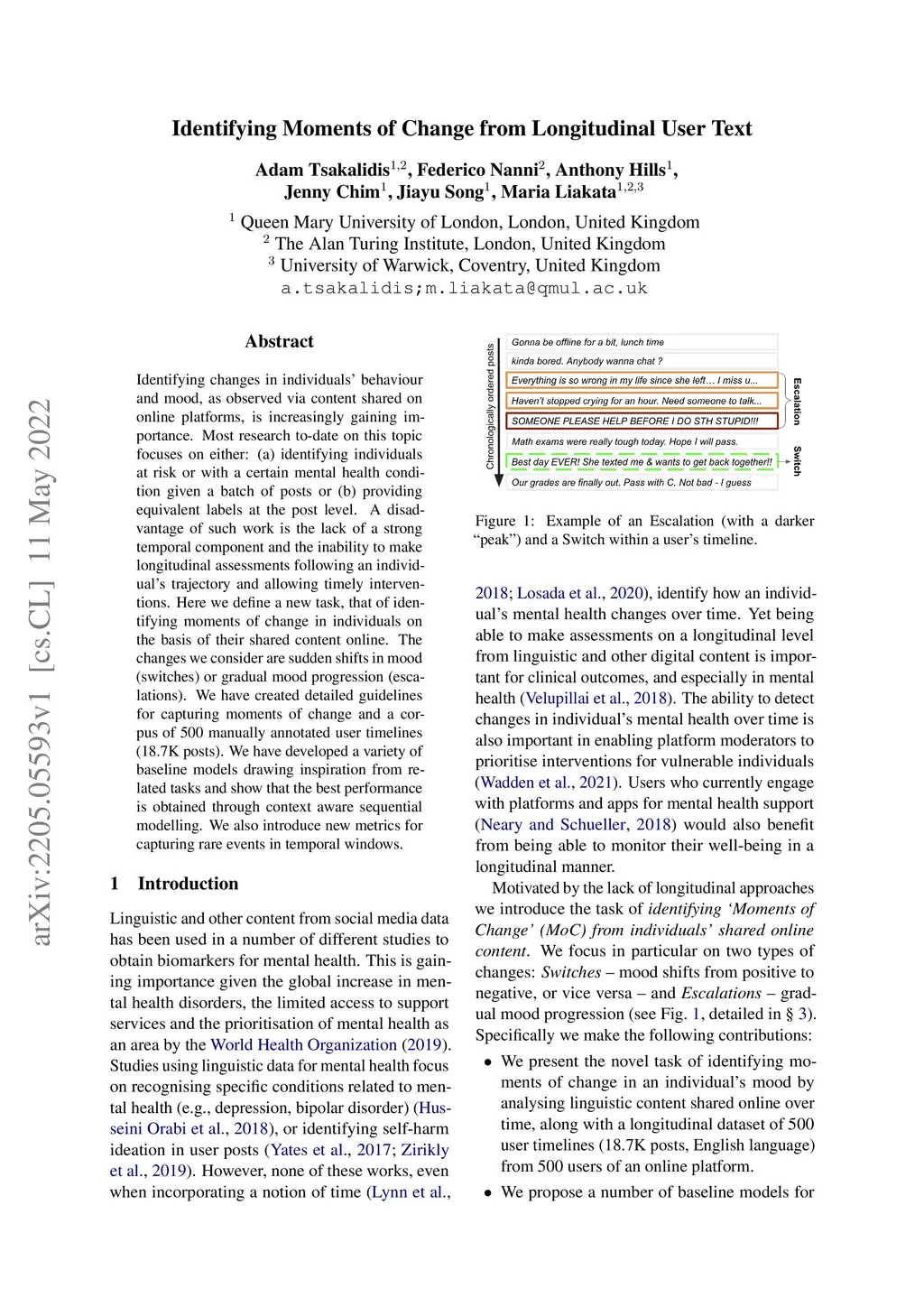 Identifying changes in individuals' behaviour and mood, as observed via content shared on online platforms, is increasingly gaining importance. Most research to-date on this topic focuses on either: (a) identifying individuals at risk or with a certain mental health condition given a batch of posts or (b) providing equivalent labels at the post level. A disadvantage of such work is the lack of a strong temporal component and the inability to make longitudinal assessments following an individual's trajectory and allowing timely interventions. Here we define a new task, that of identifying moments of change in individuals on the basis of their shared content online. The changes we consider are sudden shifts in mood (switches) or gradual mood progression (escalations). We have created detailed guidelines for capturing moments of change and a corpus of 500 manually annotated user timelines (18.7K posts). We have developed a variety of baseline models drawing inspiration from related tasks and show that the best performance is obtained through context aware sequential modelling. We also introduce new metrics for capturing rare events in temporal windows.