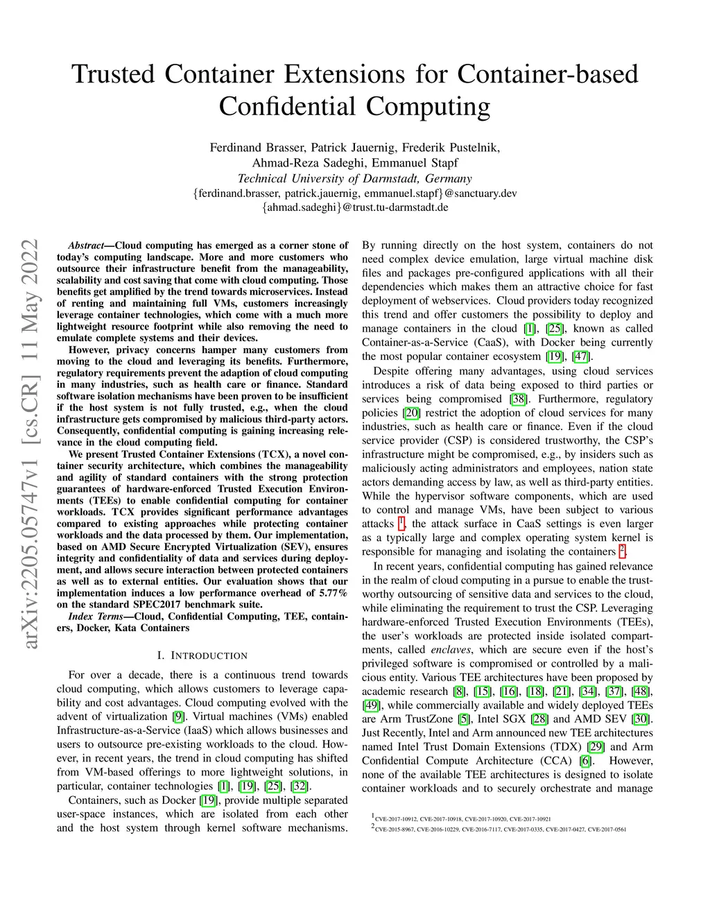 Cloud computing has emerged as a corner stone of today's computing landscape. More and more customers who outsource their infrastructure benefit from the manageability, scalability and cost saving that come with cloud computing. Those benefits get amplified by the trend towards microservices. Instead of renting and maintaining full VMs, customers increasingly leverage container technologies, which come with a much more lightweight resource footprint while also removing the need to emulate complete systems and their devices. However, privacy concerns hamper many customers from moving to the cloud and leveraging its benefits. Furthermore, regulatory requirements prevent the adaption of cloud computing in many industries, such as health care or finance. Standard software isolation mechanisms have been proven to be insufficient if the host system is not fully trusted, e.g., when the cloud infrastructure gets compromised by malicious third-party actors. Consequently, confidential computing is gaining increasing relevance in the cloud computing field. We present Trusted Container Extensions (TCX), a novel container security architecture, which combines the manageability and agility of standard containers with the strong protection guarantees of hardware-enforced Trusted Execution Environments (TEEs) to enable confidential computing for container workloads. TCX provides significant performance advantages compared to existing approaches while protecting container workloads and the data processed by them. Our implementation, based on AMD Secure Encrypted Virtualization (SEV), ensures integrity and confidentiality of data and services during deployment, and allows secure interaction between protected containers as well as to external entities. Our evaluation shows that our implementation induces a low performance overhead of 5.77% on the standard SPEC2017 benchmark suite.