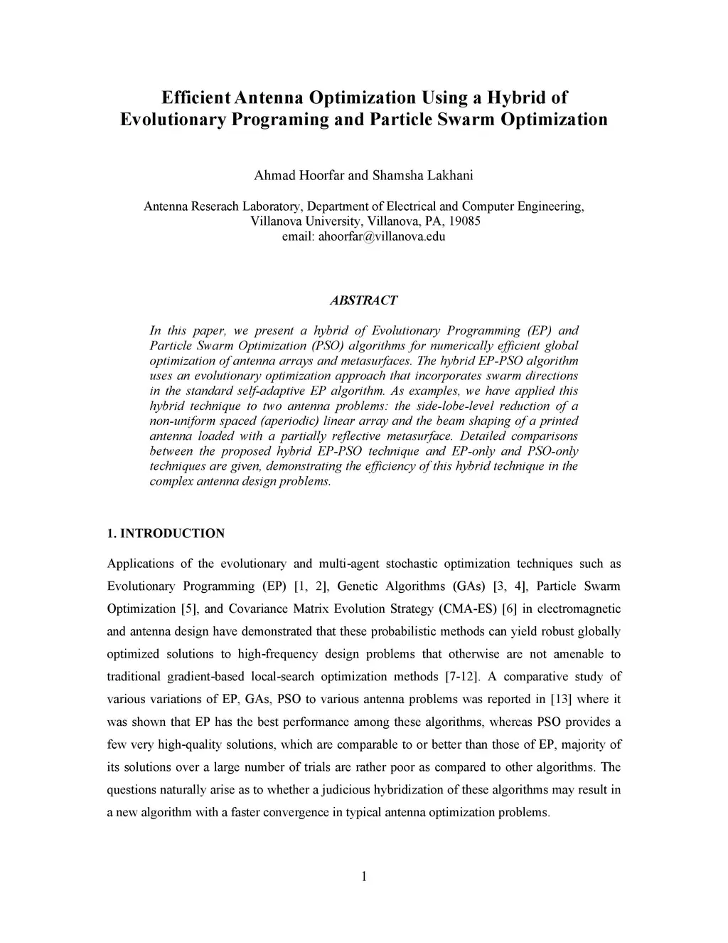 In this paper, we present a hybrid of Evolutionary Programming (EP) and Particle Swarm Optimization (PSO) algorithms for numerically efficient global optimization of antenna arrays and metasurfaces. The hybrid EP-PSO algorithm uses an evolutionary optimization approach that incorporates swarm directions in the standard self-adaptive EP algorithm. As examples, we have applied this hybrid technique to two antenna problems: the side-lobe-level reduction of a non-uniform spaced (aperiodic) linear array and the beam shaping of a printed antenna loaded with a partially reflective metasurface. Detailed comparisons between the proposed hybrid EP-PSO technique and EP-only and PSO-only techniques are given, demonstrating the efficiency of this hybrid technique in the complex antenna design problems.
