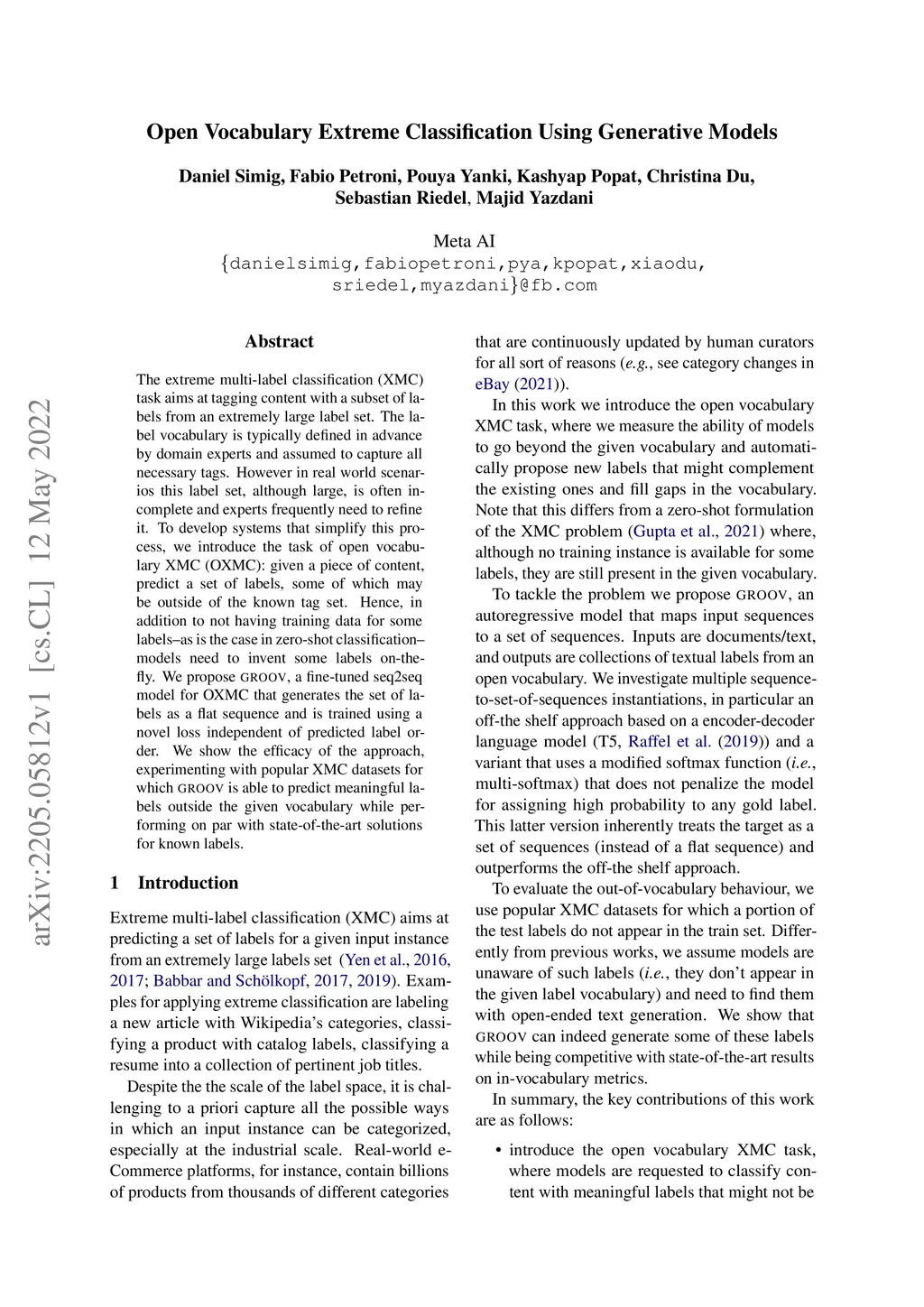 The extreme multi-label classification (XMC) task aims at tagging content with a subset of labels from an extremely large label set. The label vocabulary is typically defined in advance by domain experts and assumed to capture all necessary tags. However in real world scenarios this label set, although large, is often incomplete and experts frequently need to refine it. To develop systems that simplify this process, we introduce the task of open vocabulary XMC (OXMC): given a piece of content, predict a set of labels, some of which may be outside of the known tag set. Hence, in addition to not having training data for some labels - as is the case in zero-shot classification - models need to invent some labels on-the-fly. We propose GROOV, a fine-tuned seq2seq model for OXMC that generates the set of labels as a flat sequence and is trained using a novel loss independent of predicted label order. We show the efficacy of the approach, experimenting with popular XMC datasets for which GROOV is able to predict meaningful labels outside the given vocabulary while performing on par with state-of-the-art solutions for known labels.