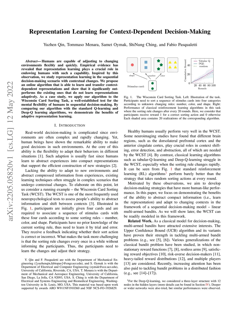 Humans are capable of adjusting to changing environments flexibly and quickly. Empirical evidence has revealed that representation learning plays a crucial role in endowing humans with such a capability. Inspired by this observation, we study representation learning in the sequential decision-making scenario with contextual changes. We propose an online algorithm that is able to learn and transfer context-dependent representations and show that it significantly outperforms the existing ones that do not learn representations adaptively. As a case study, we apply our algorithm to the Wisconsin Card Sorting Task, a well-established test for the mental flexibility of humans in sequential decision-making. By comparing our algorithm with the standard Q-learning and Deep-Q learning algorithms, we demonstrate the benefits of adaptive representation learning.