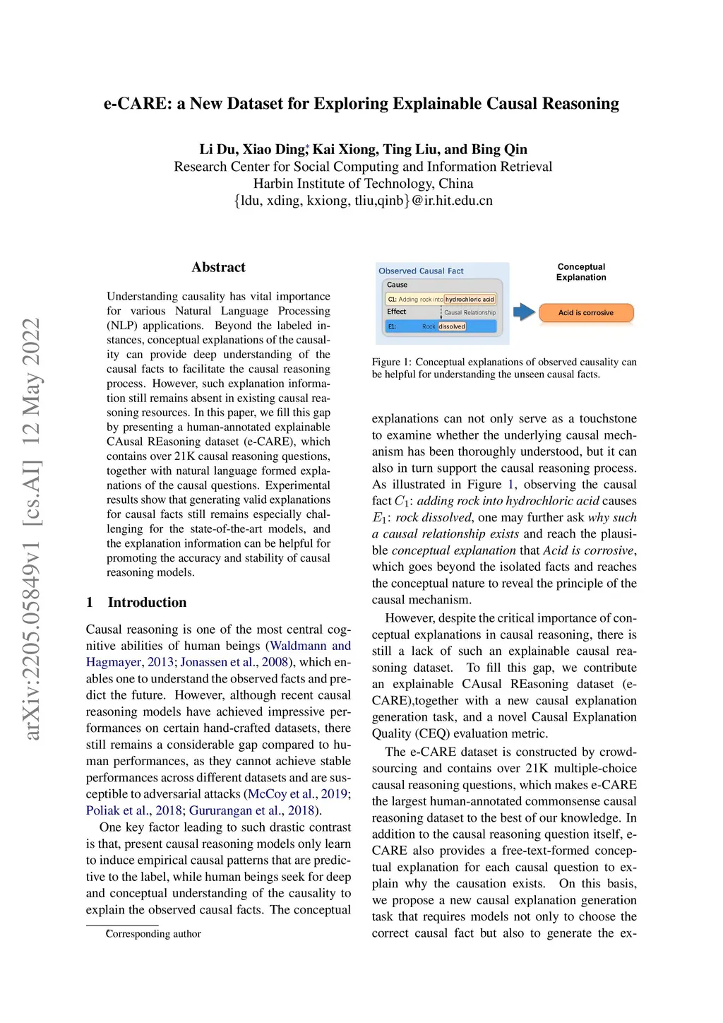 e-CARE: a New Dataset for Exploring Explainable Causal Reasoning