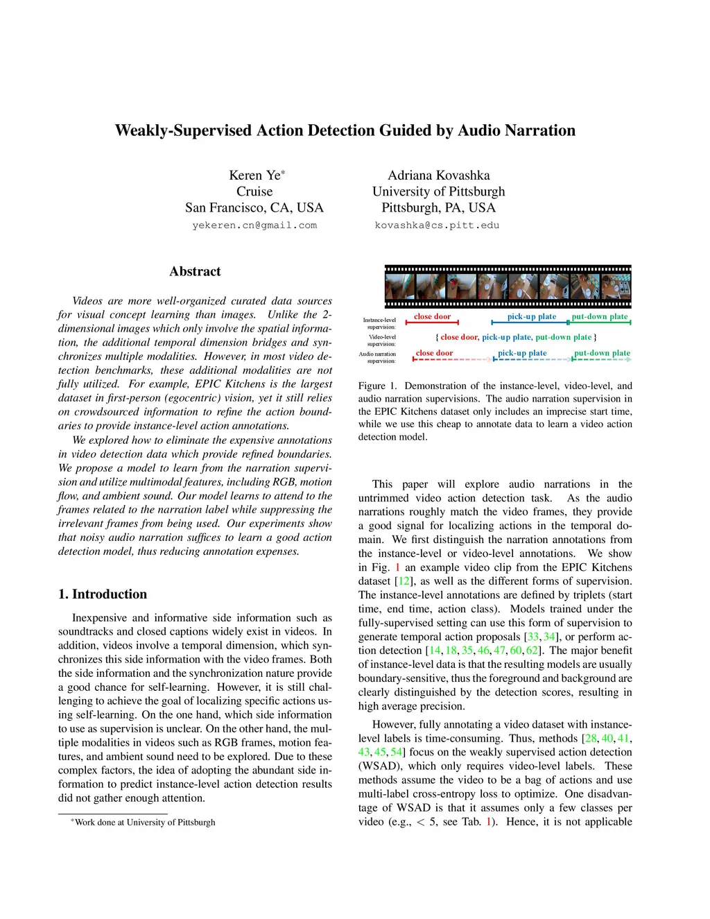 Videos are more well-organized curated data sources for visual concept learning than images. Unlike the 2-dimensional images which only involve the spatial information, the additional temporal dimension bridges and synchronizes multiple modalities. However, in most video detection benchmarks, these additional modalities are not fully utilized. For example, EPIC Kitchens is the largest dataset in first-person (egocentric) vision, yet it still relies on crowdsourced information to refine the action boundaries to provide instance-level action annotations. We explored how to eliminate the expensive annotations in video detection data which provide refined boundaries. We propose a model to learn from the narration supervision and utilize multimodal features, including RGB, motion flow, and ambient sound. Our model learns to attend to the frames related to the narration label while suppressing the irrelevant frames from being used. Our experiments show that noisy audio narration suffices to learn a good action detection model, thus reducing annotation expenses.