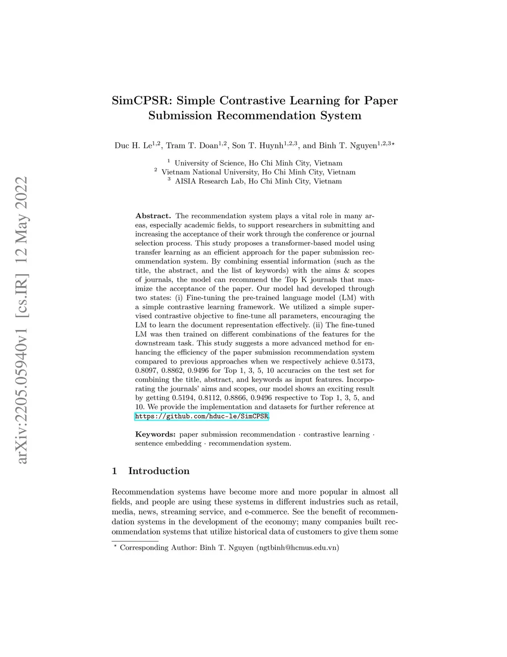 SimCPSR: Simple Contrastive Learning for Paper Submission Recommendation