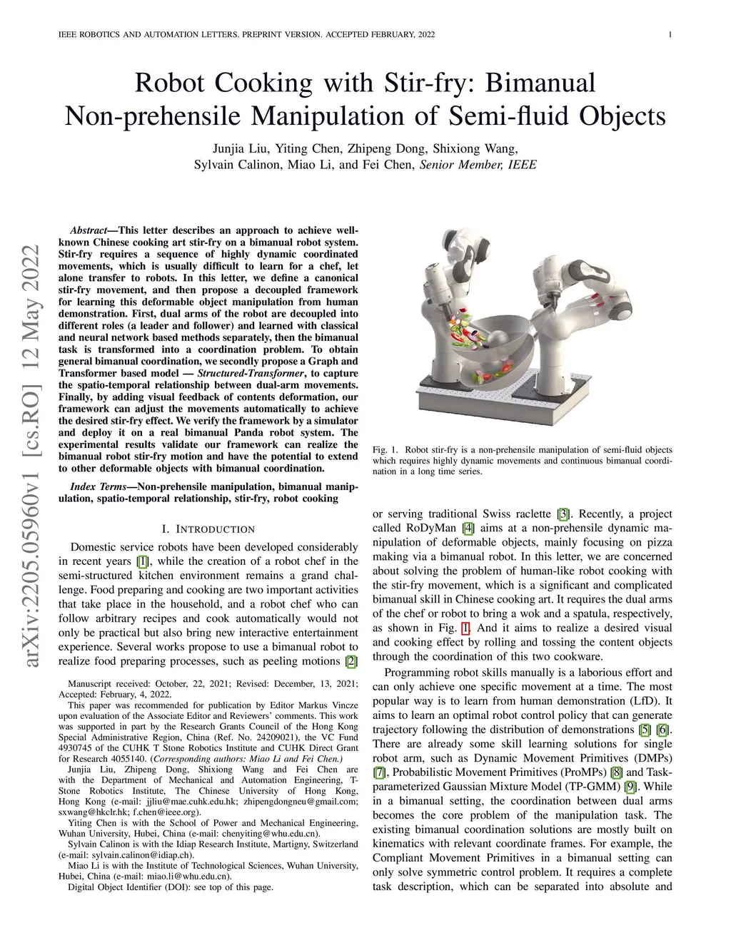This letter describes an approach to achieve well-known Chinese cooking art stir-fry on a bimanual robot system. Stir-fry requires a sequence of highly dynamic coordinated movements, which is usually difficult to learn for a chef, let alone transfer to robots. In this letter, we define a canonical stir-fry movement, and then propose a decoupled framework for learning this deformable object manipulation from human demonstration. First, the dual arms of the robot are decoupled into different roles (a leader and follower) and learned with classical and neural network-based methods separately, then the bimanual task is transformed into a coordination problem. To obtain general bimanual coordination, we secondly propose a Graph and Transformer based model -- Structured-Transformer, to capture the spatio-temporal relationship between dual-arm movements. Finally, by adding visual feedback of content deformation, our framework can adjust the movements automatically to achieve the desired stir-fry effect. We verify the framework by a simulator and deploy it on a real bimanual Panda robot system. The experimental results validate our framework can realize the bimanual robot stir-fry motion and have the potential to extend to other deformable objects with bimanual coordination.