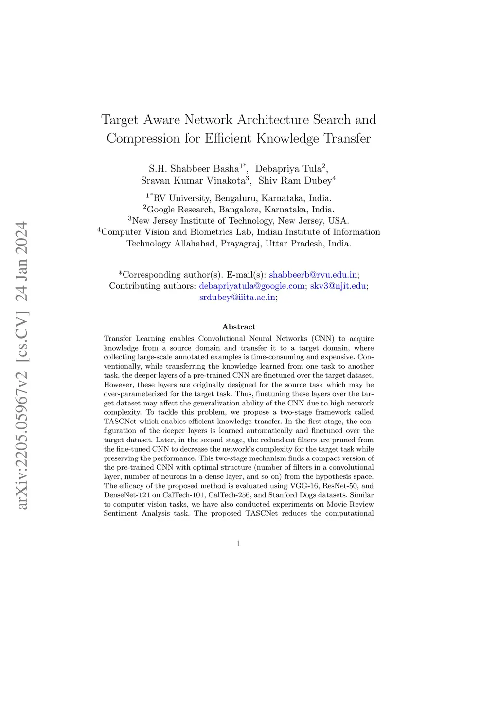 Transfer Learning enables Convolutional Neural Networks (CNN) to acquire knowledge from a source domain and transfer it to a target domain, where collecting large-scale annotated examples is time-consuming and expensive. Conventionally, while transferring the knowledge learned from one task to another task, the deeper layers of a pre-trained CNN are finetuned over the target dataset. However, these layers are originally designed for the source task which may be over-parameterized for the target task. Thus, finetuning these layers over the target dataset may affect the generalization ability of the CNN due to high network complexity. To tackle this problem, we propose a two-stage framework called TASCNet which enables efficient knowledge transfer. In the first stage, the configuration of the deeper layers is learned automatically and finetuned over the target dataset. Later, in the second stage, the redundant filters are pruned from the fine-tuned CNN to decrease the network's complexity for the target task while preserving the performance. This two-stage mechanism finds a compact version of the pre-trained CNN with optimal structure (number of filters in a convolutional layer, number of neurons in a dense layer, and so on) from the hypothesis space. The efficacy of the proposed method is evaluated using VGG-16, ResNet-50, and DenseNet-121 on CalTech-101, CalTech-256, and Stanford Dogs datasets. Similar to computer vision tasks, we have also conducted experiments on Movie Review Sentiment Analysis task. The proposed TASCNet reduces the computational complexity of pre-trained CNNs over the target task by reducing both trainable parameters and FLOPs which enables resource-efficient knowledge transfer. The source code is available at: https://github.com/Debapriya-Tula/TASCNet.