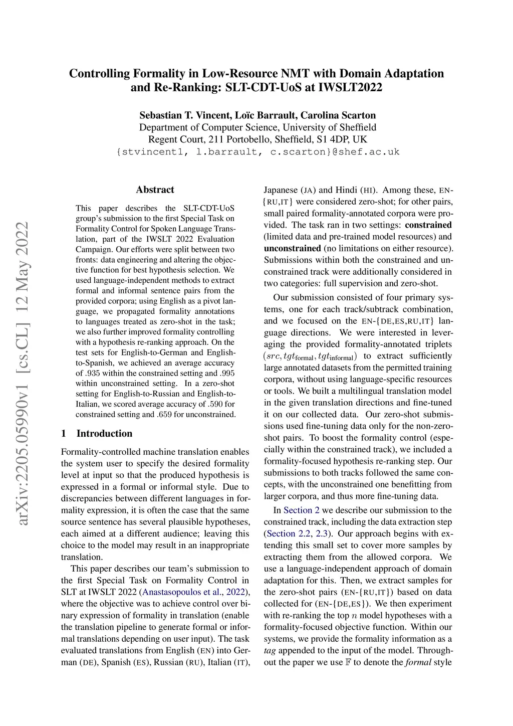 This paper describes the SLT-CDT-UoS group's submission to the first Special Task on Formality Control for Spoken Language Translation, part of the IWSLT 2022 Evaluation Campaign. Our efforts were split between two fronts: data engineering and altering the objective function for best hypothesis selection. We used language-independent methods to extract formal and informal sentence pairs from the provided corpora; using English as a pivot language, we propagated formality annotations to languages treated as zero-shot in the task; we also further improved formality controlling with a hypothesis re-ranking approach. On the test sets for English-to-German and English-to-Spanish, we achieved an average accuracy of .935 within the constrained setting and .995 within unconstrained setting. In a zero-shot setting for English-to-Russian and English-to-Italian, we scored average accuracy of .590 for constrained setting and .659 for unconstrained.