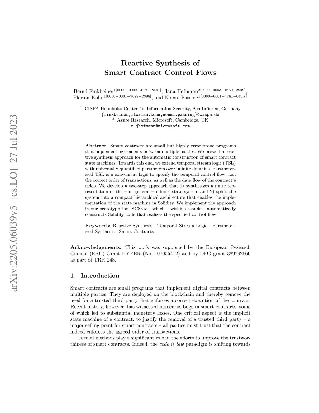 Reactive Synthesis of Smart Contract Control Flows