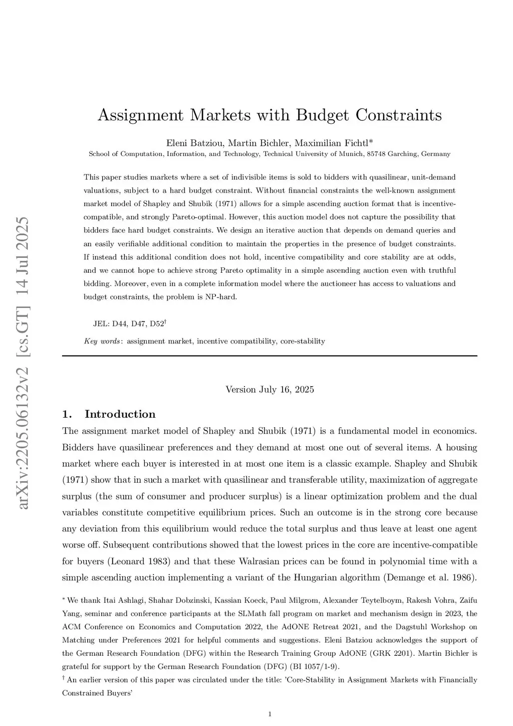 This paper studies markets where a set of indivisible items is sold to bidders with quasilinear, unit-demand valuations, subject to a hard budget constraint. Without financial constraints the well-known assignment market model of Shapley and Shubik (1971) allows for a simple ascending auction format that is incentive-compatible, and strongly Pareto-optimal. However, this auction model does not capture the possibility that bidders face hard budget constraints. We design an iterative auction that depends on demand queries and an easily verifiable additional condition to maintain the properties in the presence of budget constraints. If instead this additional condition does not hold, incentive compatibility and core stability are at odds, and we cannot hope to achieve strong Pareto optimality in a simple ascending auction even with truthful bidding. Moreover, even in a complete information model where the auctioneer has access to valuations and budget constraints, the problem is NP-hard.