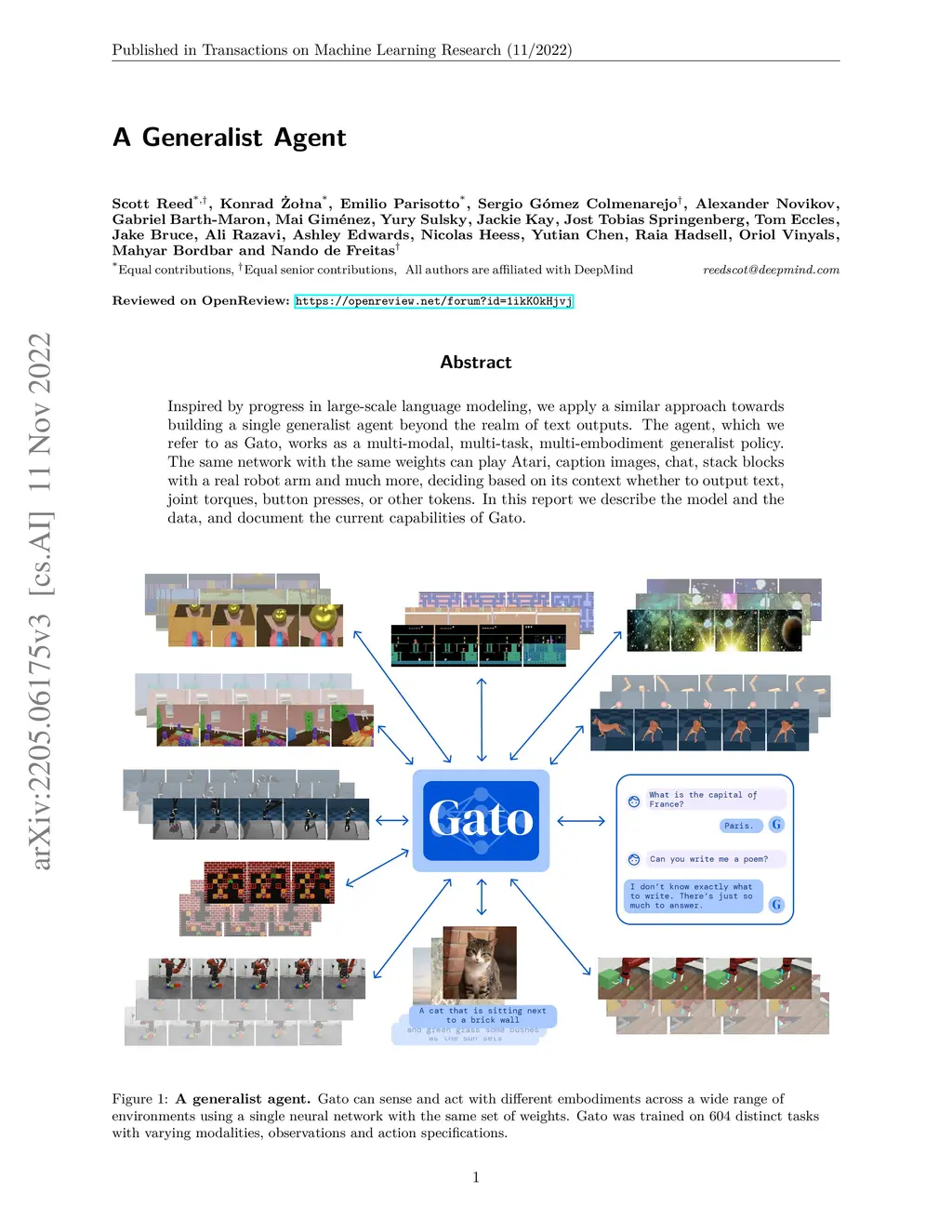 Inspired by progress in large-scale language modeling, we apply a similar approach towards building a single generalist agent beyond the realm of text outputs. The agent, which we refer to as Gato, works as a multi-modal, multi-task, multi-embodiment generalist policy. The same network with the same weights can play Atari, caption images, chat, stack blocks with a real robot arm and much more, deciding based on its context whether to output text, joint torques, button presses, or other tokens. In this report we describe the model and the data, and document the current capabilities of Gato.