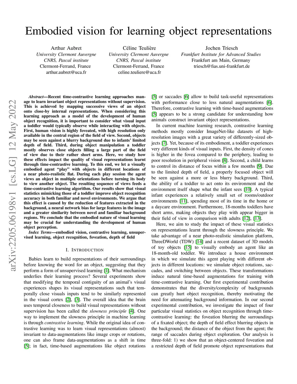 Recent time-contrastive learning approaches manage to learn invariant object representations without supervision. This is achieved by mapping successive views of an object onto close-by internal representations. When considering this learning approach as a model of the development of human object recognition, it is important to consider what visual input a toddler would typically observe while interacting with objects. First, human vision is highly foveated, with high resolution only available in the central region of the field of view. Second, objects may be seen against a blurry background due to infants' limited depth of field. Third, during object manipulation a toddler mostly observes close objects filling a large part of the field of view due to their rather short arms. Here, we study how these effects impact the quality of visual representations learnt through time-contrastive learning. To this end, we let a visually embodied agent "play" with objects in different locations of a near photo-realistic flat. During each play session the agent views an object in multiple orientations before turning its body to view another object. The resulting sequence of views feeds a time-contrastive learning algorithm. Our results show that visual statistics mimicking those of a toddler improve object recognition accuracy in both familiar and novel environments. We argue that this effect is caused by the reduction of features extracted in the background, a neural network bias for large features in the image and a greater similarity between novel and familiar background regions. We conclude that the embodied nature of visual learning may be crucial for understanding the development of human object perception.