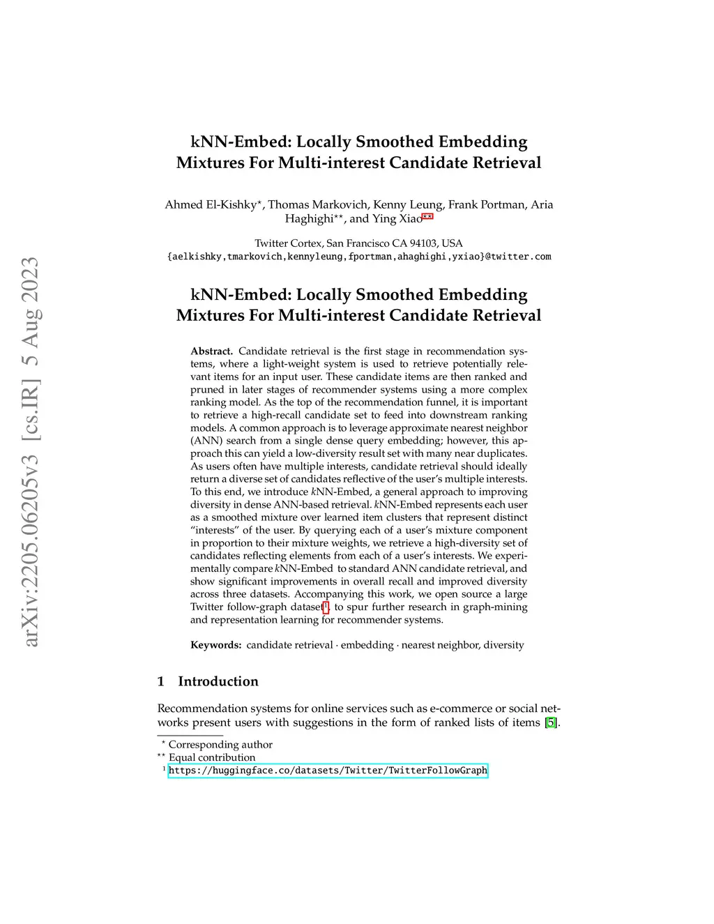 Candidate retrieval is the first stage in recommendation systems, where a light-weight system is used to retrieve potentially relevant items for an input user. These candidate items are then ranked and pruned in later stages of recommender systems using a more complex ranking model. As the top of the recommendation funnel, it is important to retrieve a high-recall candidate set to feed into downstream ranking models. A common approach is to leverage approximate nearest neighbor (ANN) search from a single dense query embedding; however, this approach this can yield a low-diversity result set with many near duplicates. As users often have multiple interests, candidate retrieval should ideally return a diverse set of candidates reflective of the user's multiple interests. To this end, we introduce kNN-Embed, a general approach to improving diversity in dense ANN-based retrieval. kNN-Embed represents each user as a smoothed mixture over learned item clusters that represent distinct "interests" of the user. By querying each of a user's mixture component in proportion to their mixture weights, we retrieve a high-diversity set of candidates reflecting elements from each of a user's interests. We experimentally compare kNN-Embed to standard ANN candidate retrieval, and show significant improvements in overall recall and improved diversity across three datasets. Accompanying this work, we open source a large Twitter follow-graph dataset (https://huggingface.co/datasets/Twitter/TwitterFollowGraph), to spur further research in graph-mining and representation learning for recommender systems.