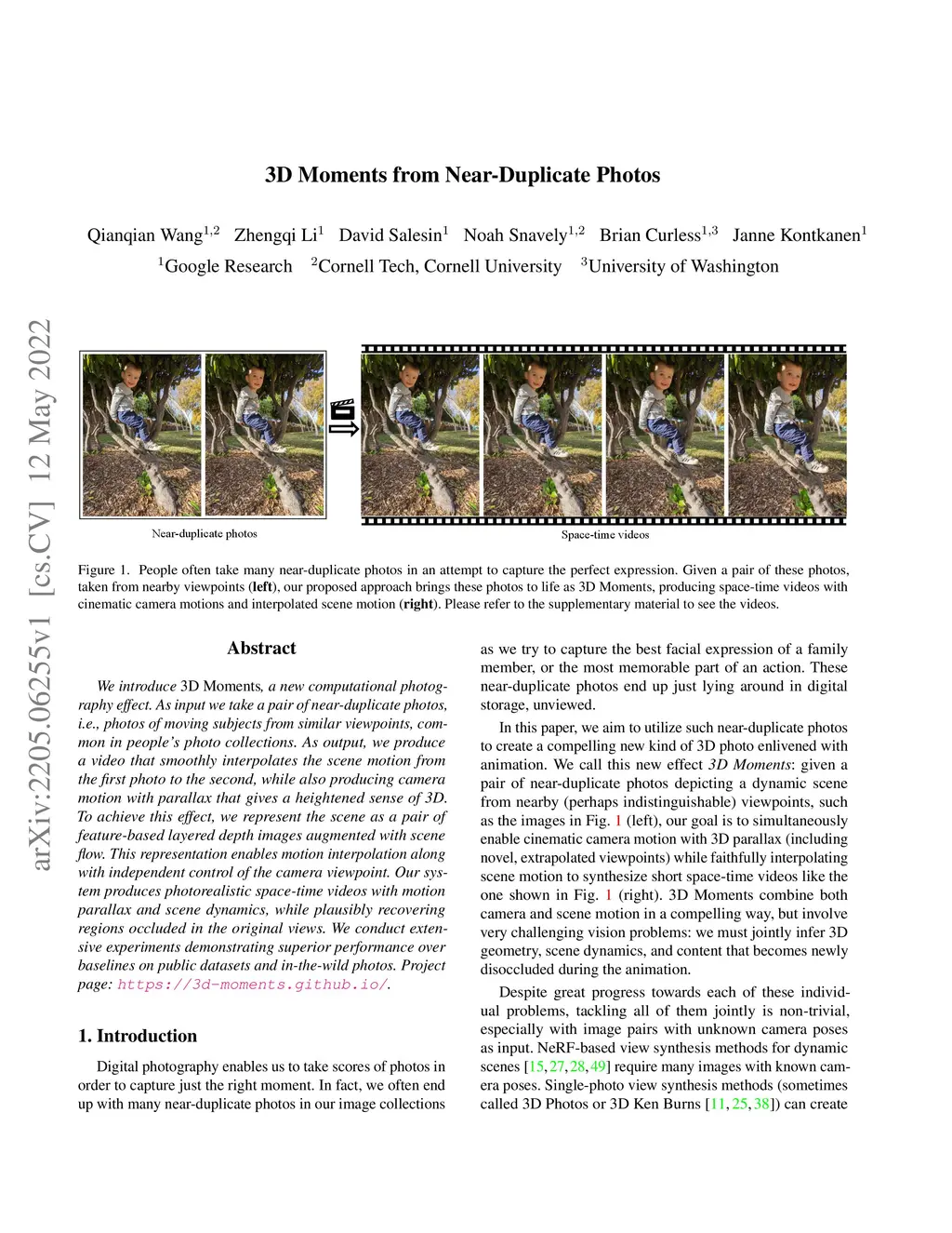 We introduce 3D Moments, a new computational photography effect. As input we take a pair of near-duplicate photos, i.e., photos of moving subjects from similar viewpoints, common in people's photo collections. As output, we produce a video that smoothly interpolates the scene motion from the first photo to the second, while also producing camera motion with parallax that gives a heightened sense of 3D. To achieve this effect, we represent the scene as a pair of feature-based layered depth images augmented with scene flow. This representation enables motion interpolation along with independent control of the camera viewpoint. Our system produces photorealistic space-time videos with motion parallax and scene dynamics, while plausibly recovering regions occluded in the original views. We conduct extensive experiments demonstrating superior performance over baselines on public datasets and in-the-wild photos. Project page: https://3d-moments.github.io/