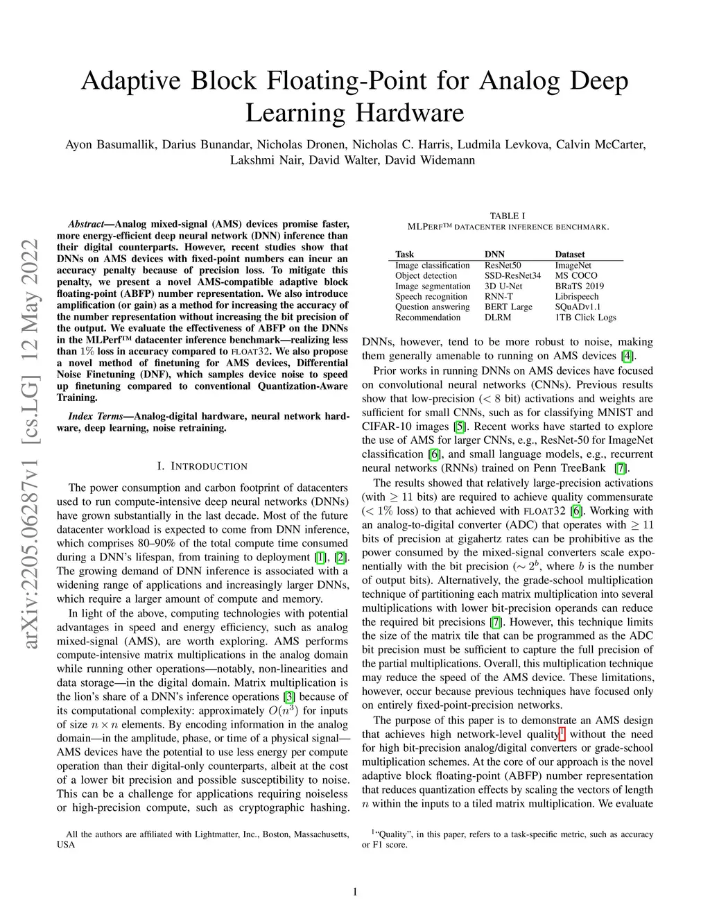 Analog mixed-signal (AMS) devices promise faster, more energy-efficient deep neural network (DNN) inference than their digital counterparts. However, recent studies show that DNNs on AMS devices with fixed-point numbers can incur an accuracy penalty because of precision loss. To mitigate this penalty, we present a novel AMS-compatible adaptive block floating-point (ABFP) number representation. We also introduce amplification (or gain) as a method for increasing the accuracy of the number representation without increasing the bit precision of the output. We evaluate the effectiveness of ABFP on the DNNs in the MLPerf datacenter inference benchmark -- realizing less than loss in accuracy compared to FLOAT32. We also propose a novel method of finetuning for AMS devices, Differential Noise Finetuning (DNF), which samples device noise to speed up finetuning compared to conventional Quantization-Aware Training.