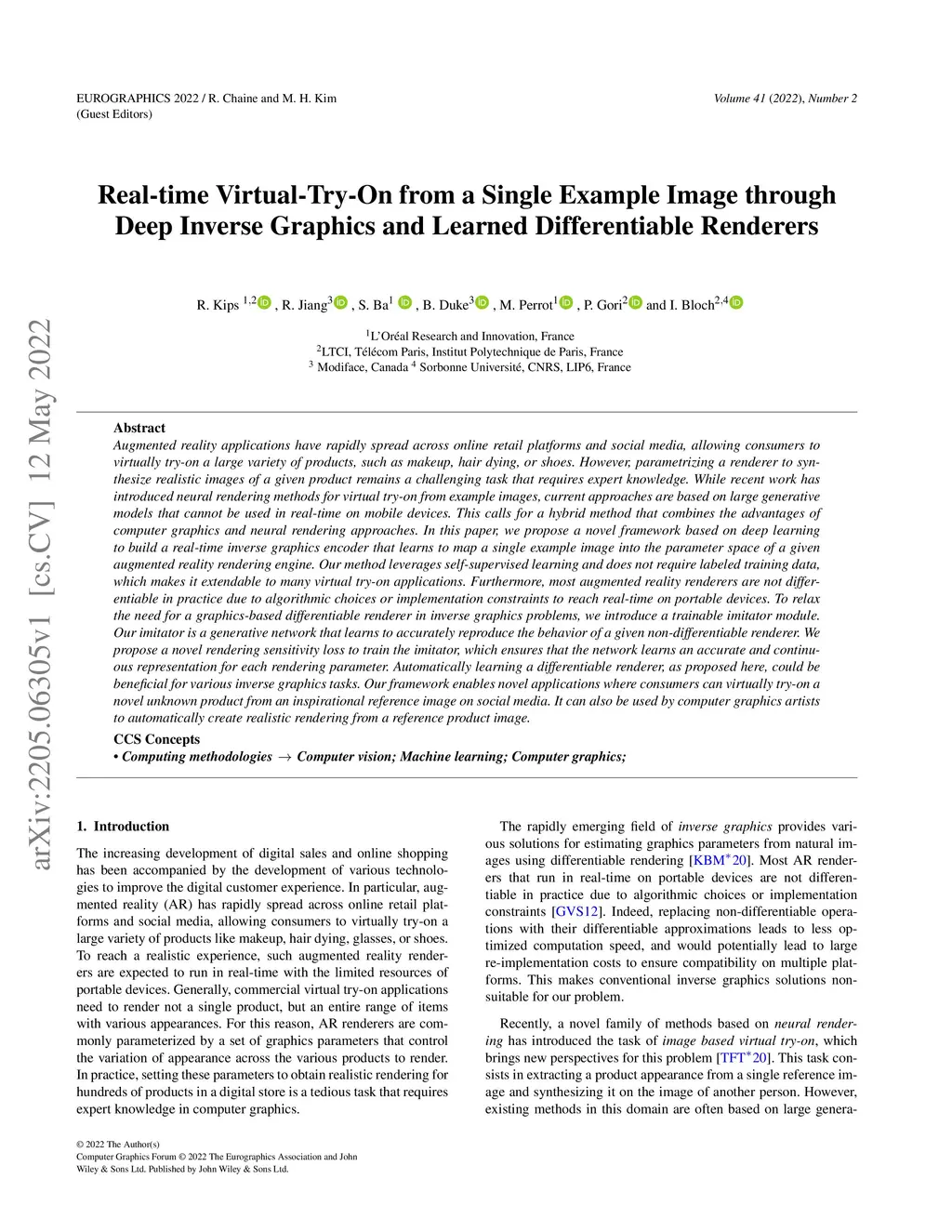Augmented reality applications have rapidly spread across online platforms, allowing consumers to virtually try-on a variety of products, such as makeup, hair dying, or shoes. However, parametrizing a renderer to synthesize realistic images of a given product remains a challenging task that requires expert knowledge. While recent work has introduced neural rendering methods for virtual try-on from example images, current approaches are based on large generative models that cannot be used in real-time on mobile devices. This calls for a hybrid method that combines the advantages of computer graphics and neural rendering approaches. In this paper we propose a novel framework based on deep learning to build a real-time inverse graphics encoder that learns to map a single example image into the parameter space of a given augmented reality rendering engine. Our method leverages self-supervised learning and does not require labeled training data which makes it extendable to many virtual try-on applications. Furthermore, most augmented reality renderers are not differentiable in practice due to algorithmic choices or implementation constraints to reach real-time on portable devices. To relax the need for a graphics-based differentiable renderer in inverse graphics problems, we introduce a trainable imitator module. Our imitator is a generative network that learns to accurately reproduce the behavior of a given non-differentiable renderer. We propose a novel rendering sensitivity loss to train the imitator, which ensures that the network learns an accurate and continuous representation for each rendering parameter. Our framework enables novel applications where consumers can virtually try-on a novel unknown product from an inspirational reference image on social media. It can also be used by graphics artists to automatically create realistic rendering from a reference product image.