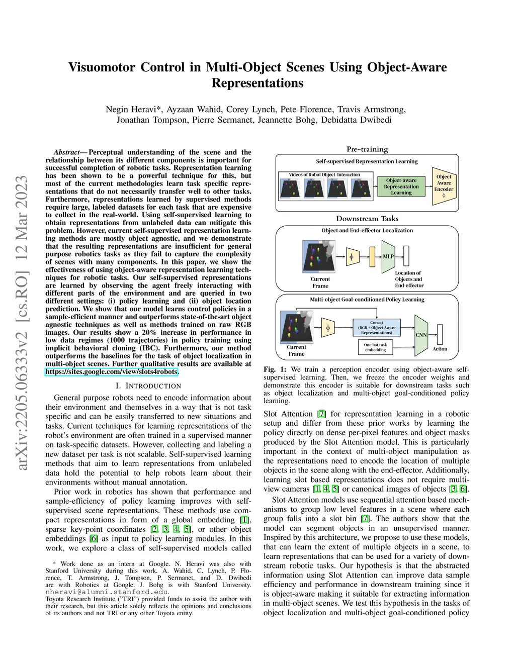Perceptual understanding of the scene and the relationship between its different components is important for successful completion of robotic tasks. Representation learning has been shown to be a powerful technique for this, but most of the current methodologies learn task specific representations that do not necessarily transfer well to other tasks. Furthermore, representations learned by supervised methods require large labeled datasets for each task that are expensive to collect in the real world. Using self-supervised learning to obtain representations from unlabeled data can mitigate this problem. However, current self-supervised representation learning methods are mostly object agnostic, and we demonstrate that the resulting representations are insufficient for general purpose robotics tasks as they fail to capture the complexity of scenes with many components. In this paper, we explore the effectiveness of using object-aware representation learning techniques for robotic tasks. Our self-supervised representations are learned by observing the agent freely interacting with different parts of the environment and is queried in two different settings: (i) policy learning and (ii) object location prediction. We show that our model learns control policies in a sample-efficient manner and outperforms state-of-the-art object agnostic techniques as well as methods trained on raw RGB images. Our results show a 20 percent increase in performance in low data regimes (1000 trajectories) in policy training using implicit behavioral cloning (IBC). Furthermore, our method outperforms the baselines for the task of object localization in multi-object scenes.