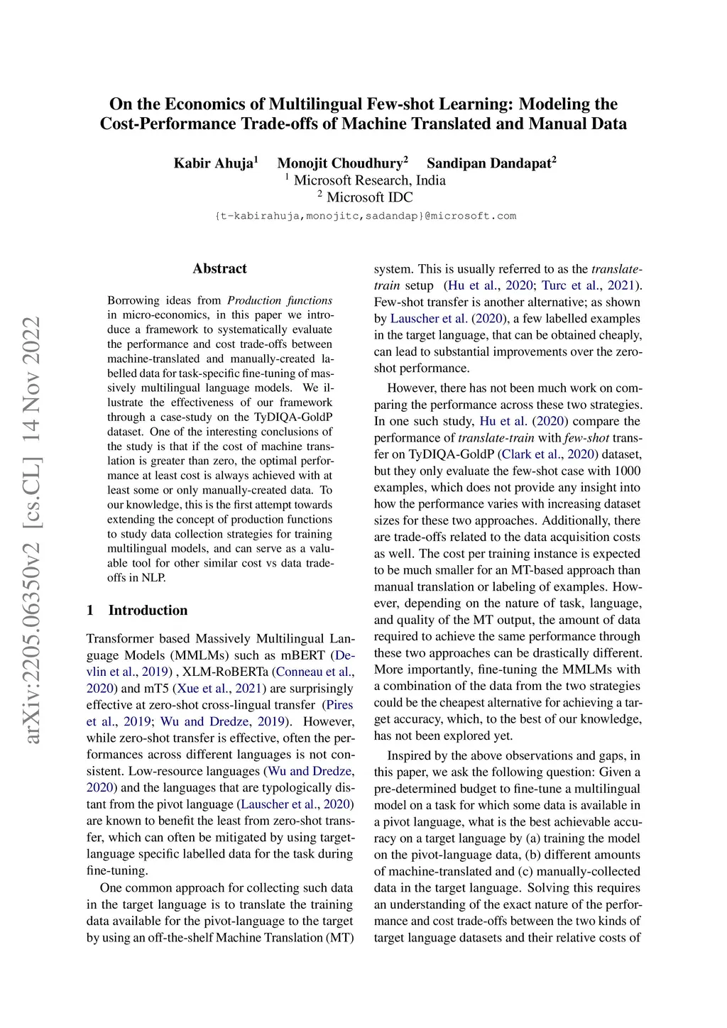 On the Economics of Multilingual Few-shot Learning: Modeling the