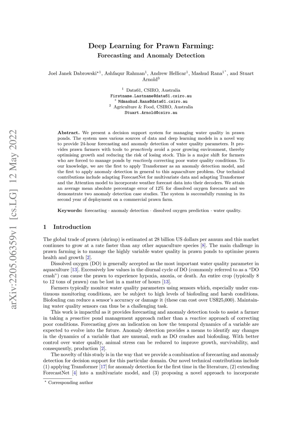 We present a decision support system for managing water quality in prawn ponds. The system uses various sources of data and deep learning models in a novel way to provide 24-hour forecasting and anomaly detection of water quality parameters. It provides prawn farmers with tools to proactively avoid a poor growing environment, thereby optimising growth and reducing the risk of losing stock. This is a major shift for farmers who are forced to manage ponds by reactively correcting poor water quality conditions. To our knowledge, we are the first to apply Transformer as an anomaly detection model, and the first to apply anomaly detection in general to this aquaculture problem. Our technical contributions include adapting ForecastNet for multivariate data and adapting Transformer and the Attention model to incorporate weather forecast data into their decoders. We attain an average mean absolute percentage error of 12% for dissolved oxygen forecasts and we demonstrate two anomaly detection case studies. The system is successfully running in its second year of deployment on a commercial prawn farm.