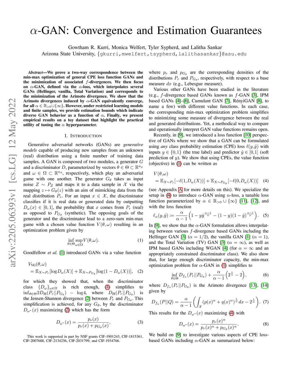 We prove a two-way correspondence between the min-max optimization of general CPE loss function GANs and the minimization of associated -divergences. We then focus on -GAN, defined via the -loss, which interpolates several GANs (Hellinger, vanilla, Total Variation) and corresponds to the minimization of the Arimoto divergence. We show that the Arimoto divergences induced by -GAN equivalently converge, for all . However, under restricted learning models and finite samples, we provide estimation bounds which indicate diverse GAN behavior as a function of . Finally, we present empirical results on a toy dataset that highlight the practical utility of tuning the hyperparameter.