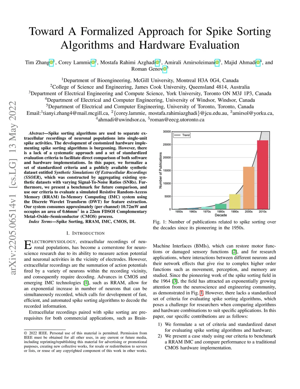 Spike sorting algorithms are used to separate extracellular recordings of neuronal populations into single-unit spike activities. The development of customized hardware implementing spike sorting algorithms is burgeoning. However, there is a lack of a systematic approach and a set of standardized evaluation criteria to facilitate direct comparison of both software and hardware implementations. In this paper, we formalize a set of standardized criteria and a publicly available synthetic dataset entitled Synthetic Simulations Of Extracellular Recordings (SSOER), which was constructed by aggregating existing synthetic datasets with varying Signal-To-Noise Ratios (SNRs). Furthermore, we present a benchmark for future comparison, and use our criteria to evaluate a simulated Resistive Random-Access Memory (RRAM) In-Memory Computing (IMC) system using the Discrete Wavelet Transform (DWT) for feature extraction. Our system consumes approximately (per channel) 10.72mW and occupies an area of 0.66mm in a 22nm FDSOI Complementary Metal-Oxide-Semiconductor (CMOS) process.