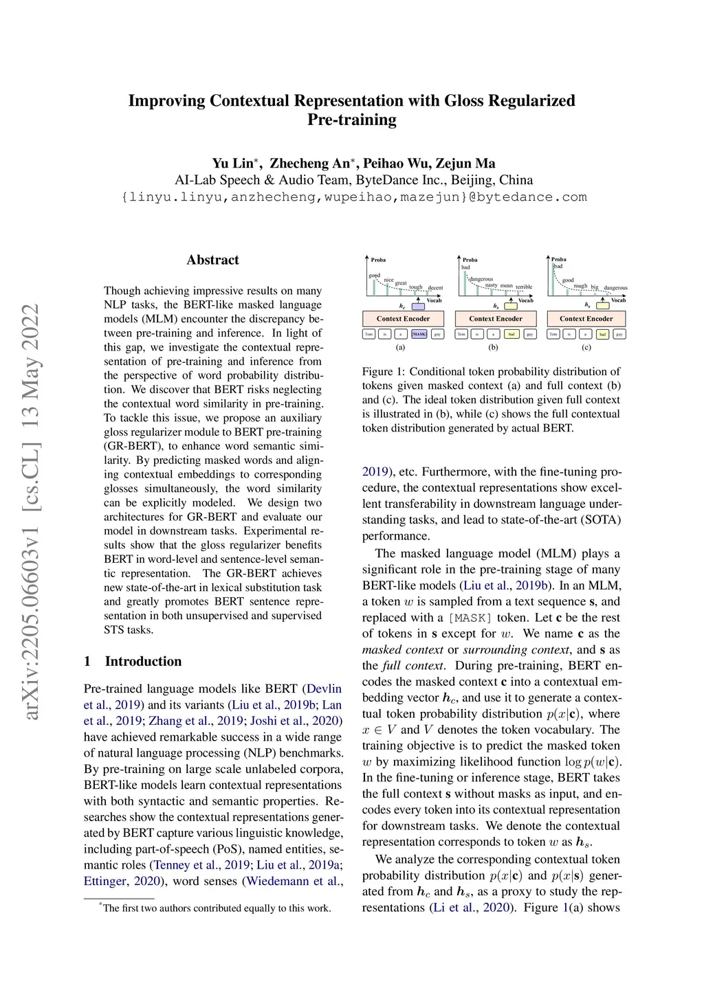 Though achieving impressive results on many NLP tasks, the BERT-like masked language models (MLM) encounter the discrepancy between pre-training and inference. In light of this gap, we investigate the contextual representation of pre-training and inference from the perspective of word probability distribution. We discover that BERT risks neglecting the contextual word similarity in pre-training. To tackle this issue, we propose an auxiliary gloss regularizer module to BERT pre-training (GR-BERT), to enhance word semantic similarity. By predicting masked words and aligning contextual embeddings to corresponding glosses simultaneously, the word similarity can be explicitly modeled. We design two architectures for GR-BERT and evaluate our model in downstream tasks. Experimental results show that the gloss regularizer benefits BERT in word-level and sentence-level semantic representation. The GR-BERT achieves new state-of-the-art in lexical substitution task and greatly promotes BERT sentence representation in both unsupervised and supervised STS tasks.