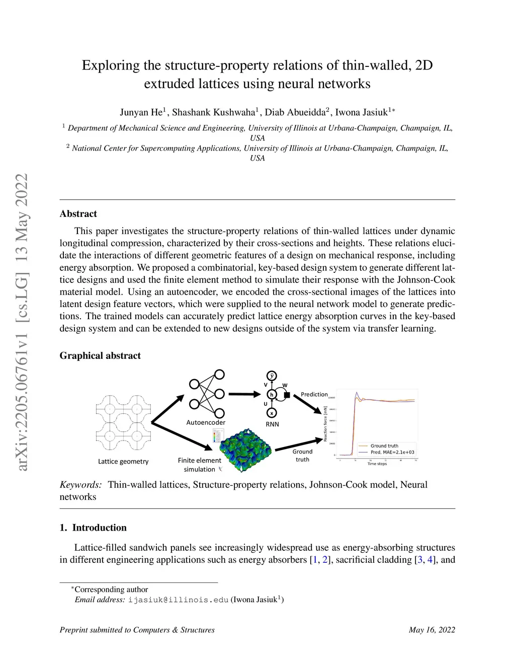 This paper investigates the structure-property relations of thin-walled lattices under dynamic longitudinal compression, characterized by their cross-sections and heights. These relations elucidate the interactions of different geometric features of a design on mechanical response, including energy absorption. We proposed a combinatorial, key-based design system to generate different lattice designs and used the finite element method to simulate their response with the Johnson-Cook material model. Using an autoencoder, we encoded the cross-sectional images of the lattices into latent design feature vectors, which were supplied to the neural network model to generate predictions. The trained models can accurately predict lattice energy absorption curves in the key-based design system and can be extended to new designs outside of the system via transfer learning.