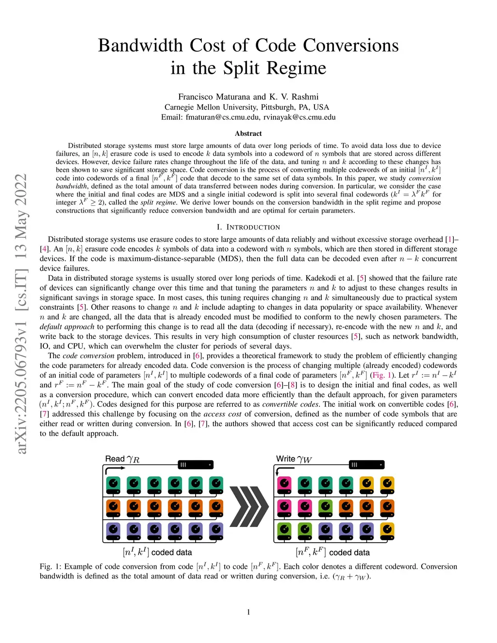 Distributed storage systems must store large amounts of data over long periods of time. To avoid data loss due to device failures, an erasure code is used to encode data symbols into a codeword of symbols that are stored across different devices. However, device failure rates change throughout the life of the data, and tuning and according to these changes has been shown to save significant storage space. Code conversion is the process of converting multiple codewords of an initial code into codewords of a final code that decode to the same set of data symbols. In this paper, we study conversion bandwidth, defined as the total amount of data transferred between nodes during conversion. In particular, we consider the case where the initial and final codes are MDS and a single initial codeword is split into several final codewords ( for integer ), called the split regime. We derive lower bounds on the conversion bandwidth in the split regime and propose constructions that significantly reduce conversion bandwidth and are optimal for certain parameters.