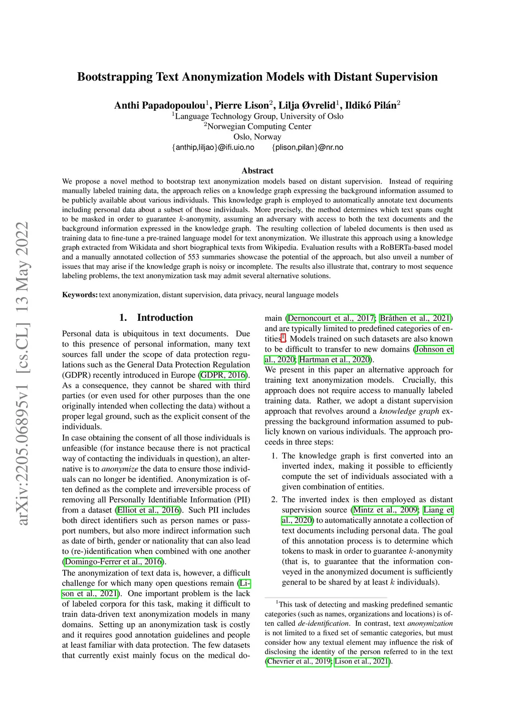 Bootstrapping Text Anonymization Models with Distant Supervision