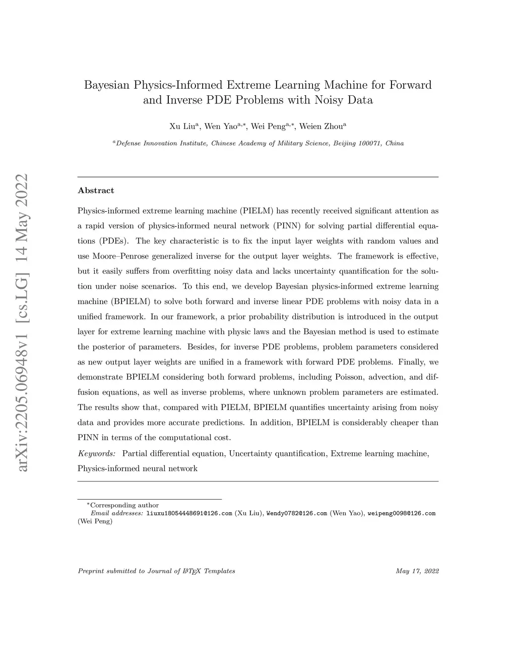 Bayesian Physics-Informed Extreme Learning Machine for Forward and