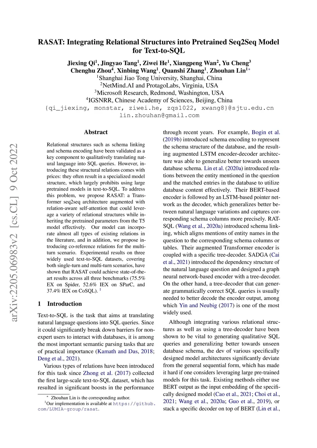 Relational structures such as schema linking and schema encoding have been validated as a key component to qualitatively translating natural language into SQL queries. However, introducing these structural relations comes with prices: they often result in a specialized model structure, which largely prohibits using large pretrained models in text-to-SQL. To address this problem, we propose RASAT: a Transformer seq2seq architecture augmented with relation-aware self-attention that could leverage a variety of relational structures while inheriting the pretrained parameters from the T5 model effectively. Our model can incorporate almost all types of existing relations in the literature, and in addition, we propose introducing co-reference relations for the multi-turn scenario. Experimental results on three widely used text-to-SQL datasets, covering both single-turn and multi-turn scenarios, have shown that RASAT could achieve state-of-the-art results across all three benchmarks (75.5% EX on Spider, 52.6% IEX on SParC, and 37.4% IEX on CoSQL).