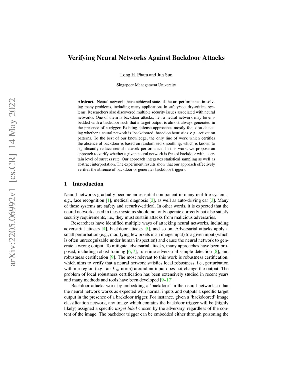 Neural networks have achieved state-of-the-art performance in solving many problems, including many applications in safety/security-critical systems. Researchers also discovered multiple security issues associated with neural networks. One of them is backdoor attacks, i.e., a neural network may be embedded with a backdoor such that a target output is almost always generated in the presence of a trigger. Existing defense approaches mostly focus on detecting whether a neural network is 'backdoored' based on heuristics, e.g., activation patterns. To the best of our knowledge, the only line of work which certifies the absence of backdoor is based on randomized smoothing, which is known to significantly reduce neural network performance. In this work, we propose an approach to verify whether a given neural network is free of backdoor with a certain level of success rate. Our approach integrates statistical sampling as well as abstract interpretation. The experiment results show that our approach effectively verifies the absence of backdoor or generates backdoor triggers.