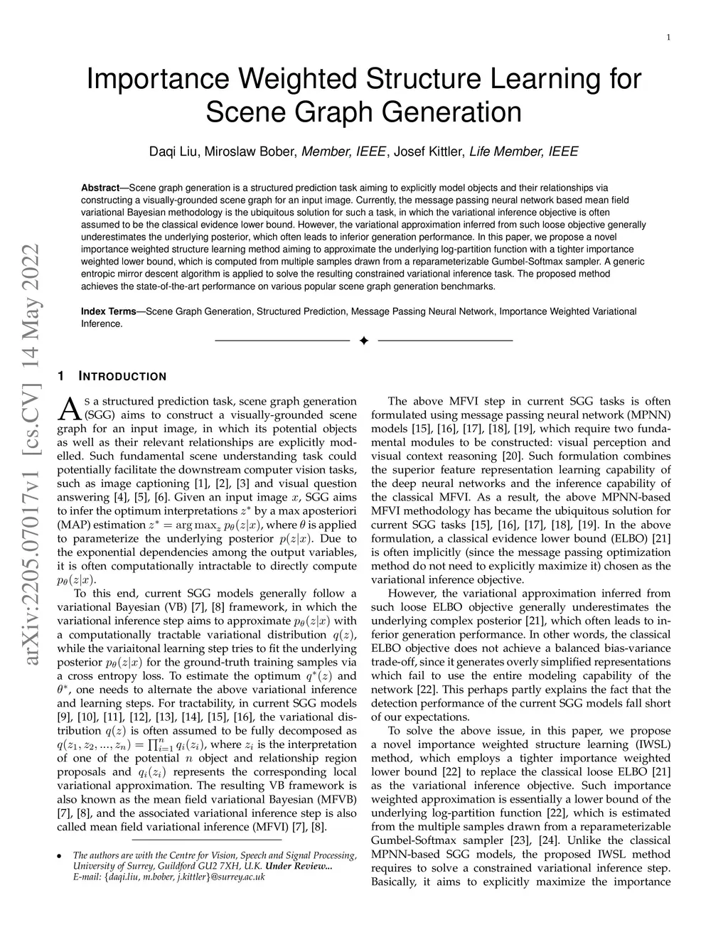 Scene graph generation is a structured prediction task aiming to explicitly model objects and their relationships via constructing a visually-grounded scene graph for an input image. Currently, the message passing neural network based mean field variational Bayesian methodology is the ubiquitous solution for such a task, in which the variational inference objective is often assumed to be the classical evidence lower bound. However, the variational approximation inferred from such loose objective generally underestimates the underlying posterior, which often leads to inferior generation performance. In this paper, we propose a novel importance weighted structure learning method aiming to approximate the underlying log-partition function with a tighter importance weighted lower bound, which is computed from multiple samples drawn from a reparameterizable Gumbel-Softmax sampler. A generic entropic mirror descent algorithm is applied to solve the resulting constrained variational inference task. The proposed method achieves the state-of-the-art performance on various popular scene graph generation benchmarks.