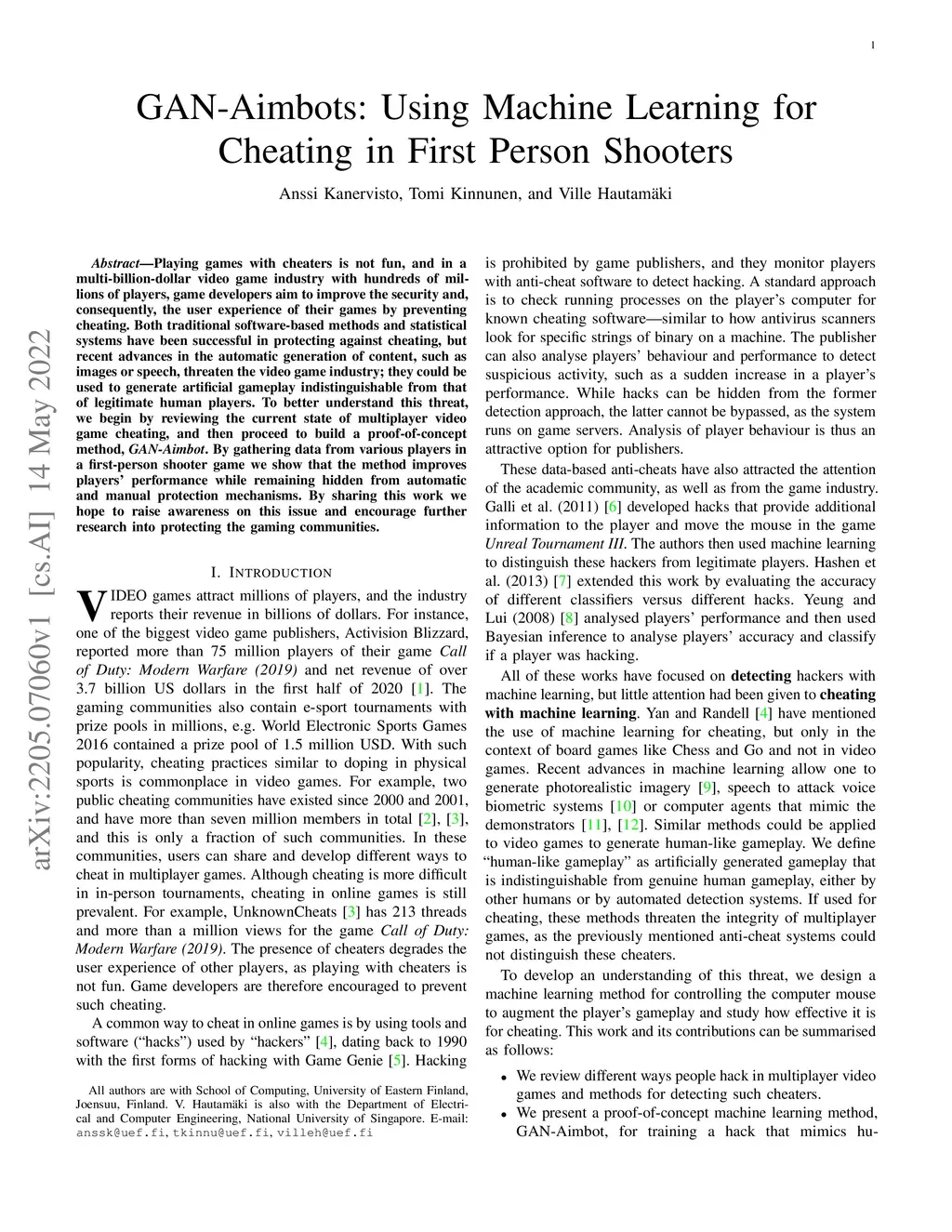 Playing games with cheaters is not fun, and in a multi-billion-dollar video game industry with hundreds of millions of players, game developers aim to improve the security and, consequently, the user experience of their games by preventing cheating. Both traditional software-based methods and statistical systems have been successful in protecting against cheating, but recent advances in the automatic generation of content, such as images or speech, threaten the video game industry; they could be used to generate artificial gameplay indistinguishable from that of legitimate human players. To better understand this threat, we begin by reviewing the current state of multiplayer video game cheating, and then proceed to build a proof-of-concept method, GAN-Aimbot. By gathering data from various players in a first-person shooter game we show that the method improves players' performance while remaining hidden from automatic and manual protection mechanisms. By sharing this work we hope to raise awareness on this issue and encourage further research into protecting the gaming communities.